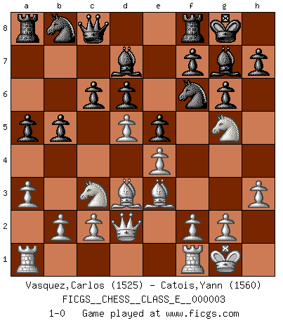 Last move : 1-0 2006 August 11 17:21:28 [Event "FICGS__CHESS__CLASS_E__000003"] [Site "FICGS"] [Date "2006.05.02"] [Round "1"] [White "Vasquez,Carlos"] [Black "Catois,Yann"] [Result "1-0"] [WhiteElo "1525"] [BlackElo "1560"] 1.e4 d6 2.d4 Nf6 3.Nc3 g6 4.Nf3 Bg7 5.Be3 O-O 6.h3 c6 7.Bd3 b5 8.O-O a5 9.a3 Bd7 10.Qd2 Qc8 11.Ng5 e5 12.d5 1-0 This chess game has been lost on time (started : 2006.05.02 13:40:26) Pirc : Classical (Two knights) system Kingside Castling by player Black (move 5) Kingside Castling by player White (move 8) Player White won this chess game. Follow this game move after move (download)If cunning alone were needed to excel, women would be the best Chess players. (Albin) Ich hatte Angst gegen einen russischen Großmeister zu verlieren, und er befürchtete gegen einen kleinen Jungen zu verlieren. (über ein Remis gegen Juri Awerbach). (Robert James Fischer) Solo existe una cosa que Fischer hace en el Ajedrez sin placer: ¡perder!. (Boris Spassky) Il n'y a pas de prix trop élevé au scalp de l'ennemi. (Koblentz) The Internet is the first thing that humanity has build that humanity doesn't understand, the largest experiment in anarchy that we have ever had. (Eric Schmidt)