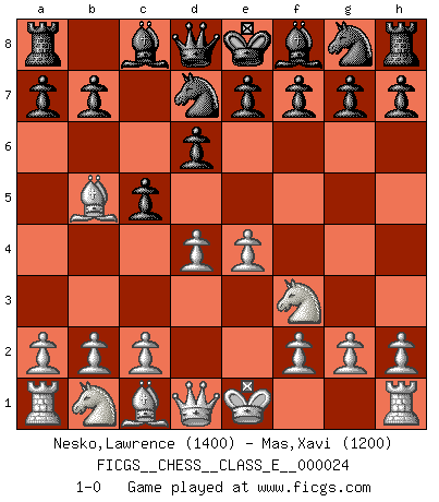 Last move : 1-0 2007 January 20 0:46:36 [Event "FICGS__CHESS__CLASS_E__000024"] [Site "FICGS"] [Date "2006.12.06"] [Round "1"] [White "Nesko,Lawrence"] [Black "Mas,Xavi"] [Result "1-0"] [WhiteElo "1400"] [BlackElo "1200"] 1.e4 c5 2.Nf3 d6 3.d4 Nd7 4.Bb5 1-0 This chess game has been lost on time (started : 2006.12.06 19:25:10) Sicilian Player White won this chess game. Follow this game move after move (download)No price is too great for the scalp of the enemy King. (Koblentz) Fallen sollten polizeilich verboten werden. (Savielly Grigorievitsch Tartakower) Las Aperturas te enseñan aperturas. ¡Los Finales te enseñan Ajedrez!. (Stephan Gerzadowicz) La vérité est comme le meilleur coup aux échecs : elle existe, mais il faut la chercher. (Arturo Perez-Reverte) When you stop learning you start dying. (Scott Adams)
