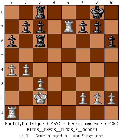 Last move : 1-0 2007 March 30 21:17:53 [Event "FICGS__CHESS__CLASS_E__000024"] [Site "FICGS"] [Date "2006.12.06"] [Round "1"] [White "Forlot,Dominique"] [Black "Nesko,Lawrence"] [Result "1-0"] [WhiteElo "1459"] [BlackElo "1400"] 1.e4 e5 2.Nf3 Nf6 3.Nxe5 d6 4.Nf3 Nxe4 5.Qe2 Qe7 6.d3 Nf6 7.Bf4 Nc6 8.Nc3 Qxe2+ 9.Bxe2 Be7 10.Kd2 a6 11.a4 Bd7 12.Rhe1 O-O 13.Ne4 Nxe4+ 14.dxe4 Bf6 15.c3 Be6 16.Ra3 Na5 17.Kc2 h6 18.e5 dxe5 19.Bxe5 Bf5+ 20.Bd3 Bxd3+ 21.Kxd3 Rad8+ 22.Kc2 Bxe5 23.Nxe5 Rd6 24.b4 Nc6 25.Nxc6 Rxc6 26.Re7 Rc8 27.Ra1 1-0 Petrov : Cozio (Lasker) attack Kingside Castling by player Black (move 12) Player White won this chess game. Follow this game move after move (download)I thought the most common mistake [in chess] was the first one: Learning the game :P (Garvin Gray, FICGS forum) Ein typischer, sehr verbreiteter Gedankenschädling ist der, daß der betreffende Amateur von der Annanhme ausgeht, daß jeder einzelne Zug etwas zu leisten habe. (Aaron Nimzowitsch) El hombre es un frívolo, una creatura engañosa y como un jugador de Ajedrez, se preocupa mas por el proceso de obtener su meta que de la meta por sí misma. (Dostoyevsky) J'ai vu le vaincu d'Echecs jouer des années durant dans l'espoir de la fête de la victoire. Car tu es plus riche de ce qu'elle existe si même elle n'est point pour toi. Ainsi de la perle du fond des mers. (Antoine de Saint-Exupéry) The question of whether computers can think is just like question of whether submarines can swim. (Edsger W. Dijkstra)
