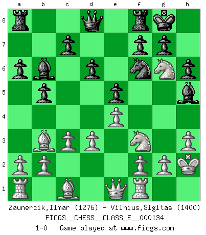 Last move : 1-0 2011 May 5 17:34:52 [Event "FICGS__CHESS__CLASS_E__000134"] [Site "FICGS"] [Date "2011.02.12"] [Round "1"] [White "Zaunercik,Ilmar"] [Black "Vilnius,Sigitas"] [Result "1-0"] [WhiteElo "1276"] [BlackElo "1400"] 1.e4 e5 2.Nf3 Nc6 3.Bb5 a6 4.Ba4 b5 5.Bb3 Bc5 6.O-O Nf6 7.c3 d6 8.d3 Bg4 9.Nbd2 O-O 10.h3 Bh5 11.Qe1 Bb6 12.Nh4 Ne7 13.Ndf3 h6 14.Kh2 Ng6 15.Nxg6 1-0 Ruy Lopez : Graz variation Kingside Castling by player White (move 6) Kingside Castling by player Black (move 9) Player White won this chess game. Follow this game move after move (download)Those who say they understand Chess, understand nothing. (Robert Hubner) Dass jemand wie Surab Asmaiparaschwili, der selbst Elopunkte gekauft hat , Vize-Präsident der Fide werden konnte, sagt schon einges über den Zustand dieser Organisation aus. (Joel Lautier) La belleza de un movimiento no se refleja solo en su apariencia, sino en el pensamiento detrás de él. (Siegbert Tarrasch) Les réformistes prétendent que les progrès de la théorie conduiront à la disparition des échecs, et qu'il faut, pour leur rendre vie, en remanier les règles. En réalité, qu'exprime cette affirmation? Le mépris de l'intuition, de l'imagination et de tous les autres éléments qui font des échecs un art. (Alexander Alekhine) For a mechanic, you seem to do an excessive amount of thinking. (C-3PO in Star Wars ep.2)