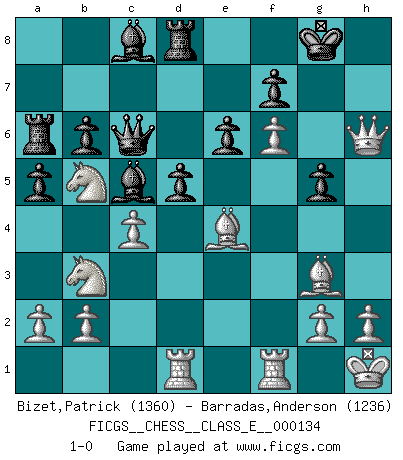 Last move : 1-0 2011 February 24 13:31:26 [Event "FICGS__CHESS__CLASS_E__000134"] [Site "FICGS"] [Date "2011.02.12"] [Round "1"] [White "Bizet,Patrick"] [Black "Barradas,Anderson"] [Result "1-0"] [WhiteElo "1360"] [BlackElo "1236"] 1.e4 c5 2.Nf3 e6 3.d4 cxd4 4.Nxd4 Bc5 5.Nb3 Bb4+ 6.c3 Be7 7.c4 Nc6 8.Nc3 Nf6 9.Be2 Bb4 10.Bf3 O-O 11.O-O Ne5 12.Qe2 b6 13.Bg5 h6 14.Bh4 g5 15.Bg3 Nc6 16.e5 Nh7 17.Rad1 a5 18.Bxc6 Ra7 19.Nb5 Ra6 20.f4 Bc5+ 21.Kh1 Qe7 22.Be4 Rd8 23.f5 d5 24.f6 Qb7 25.Qh5 Qc6 26.Qxh6 Nxf6 27.exf6 1-0 Sicilian defense Kingside Castling by player Black (move 10) Kingside Castling by player White (move 11) Player White won this chess game. Follow this game move after move (download)Chess problems demand from the composer the same virtues that characterize all worthwhile art: originality, invention, conciseness, harmony, complexity, and splendid insincerity. (Vladimir Nabokov) Fallen sollten polizeilich verboten werden. (Savielly Grigorievitsch Tartakower) Las Aperturas te enseñan aperturas. ¡Los Finales te enseñan Ajedrez!. (Stephan Gerzadowicz) Celui qui prend des risques peut perdre, celui qui n'en prend pas perd toujours. (Xavier Tartacover) A proverb is a short sentence based on long experience. (Miguel de Cervantes)