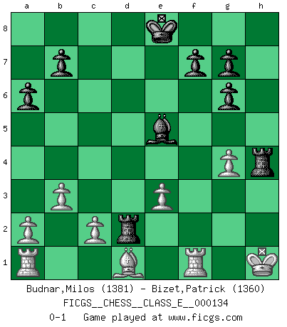 Last move : 0-1 2011 March 25 7:46:13 [Event "FICGS__CHESS__CLASS_E__000134"] [Site "FICGS"] [Date "2011.02.12"] [Round "1"] [White "Budnar,Milos"] [Black "Bizet,Patrick"] [Result "0-1"] [WhiteElo "1381"] [BlackElo "1360"] 1.e4 c5 2.Nf3 d6 3.d4 cxd4 4.Nxd4 Nf6 5.Nc3 a6 6.Be3 e5 7.Nf3 Bg4 8.h3 Bh5 9.Be2 Be7 10.Bg5 Nbd7 11.g4 Bg6 12.Bxf6 Nxf6 13.Qd3 Qb6 14.b3 Rd8 15.O-O d5 16.Nxe5 Nxe4 17.Nxg6 hxg6 18.Nxe4 dxe4 19.Qg3 Rd2 20.Bd1 Bd6 21.Qc3 e3 22.Qxe3+ Qxe3 23.fxe3 Bh2+ 24.Kh1 Rxh3 25.Rf3 Rh4 26.Rf1 Be5 0-1 Sicilian : Najdorf, Byrne (English) attack Kingside Castling by player White (move 15) Player Black won this chess game. Follow this game move after move (download)I won't play with you anymore. You have insulted my friend. - When an opponent cursed himself for a blunder. (Miguel Najdorf) Das Zentrum ist der Balkan des Schachbretts - Kriegshandlungen können in jedem Moment ausbrechen. (Aaron Nimzowitsch) Cuando tu casa esta en llamas, no puedes ser molestado por tus vecinos. O, como decinos en Ajedrez, si tu Rey esta bajo ataque, no te preocupa perder un Peón del lado de la Reina. (Gary Kasparov) Des idées, des idées, j'en ai cent, j'en ai mille. Des bonnes, des mauvaises, applicables, irréalisables... Il suffit de faire le tri ! (Roos) Happy endings are just stories that haven't finished yet. (Jane Smith in Mr & Mrs Smith)