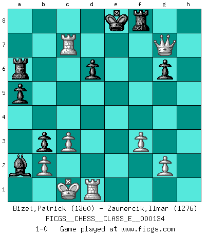 Last move : 1-0 2011 April 10 9:25:0 [Event "FICGS__CHESS__CLASS_E__000134"] [Site "FICGS"] [Date "2011.02.12"] [Round "1"] [White "Bizet,Patrick"] [Black "Zaunercik,Ilmar"] [Result "1-0"] [WhiteElo "1360"] [BlackElo "1276"] 1.e4 c5 2.Nf3 d6 3.d4 cxd4 4.Nxd4 Nf6 5.Nc3 g6 6.f3 Bg7 7.Be3 O-O 8.Qd2 Re8 9.O-O-O Nc6 10.h4 a6 11.h5 b5 12.Nxc6 Qc7 13.Nd4 b4 14.Nd5 Nxd5 15.exd5 e5 16.dxe6 Bxe6 17.hxg6 fxg6 18.Bh6 Bxd4 19.Qxd4 Bxa2 20.Bd3 b3 21.c3 a5 22.Bxg6 hxg6 23.Bf8 Rxf8 24.Rh8+ Kf7 25.Rh7+ Ke8 26.Rxc7 Ra6 27.Qg7 1-0 Sicilian : Dragon variation Kingside Castling by player Black (move 7) Queenside Castling by player White (move 9) Player White won this chess game. Follow this game move after move (download)Chess is mental torture. (Garry Kasparov) Stelle das Brett so, daß die Sonne in die Augen deines Gegners scheint. (Ruy López) El estómago es una parte esencial del maestro de Ajedrez. (Bent Larsen) D'abord les bases : Jouez et étudiez, puis étudiez et jouez, ensuite jouez et étudiez, puis étudiez et jouez. Deuxièmement : Donnez toujours le meilleur de vous-même ! (Ken Smith) Computers are like Old Testament gods; lots of rules and no mercy. (Joseph Campbell)