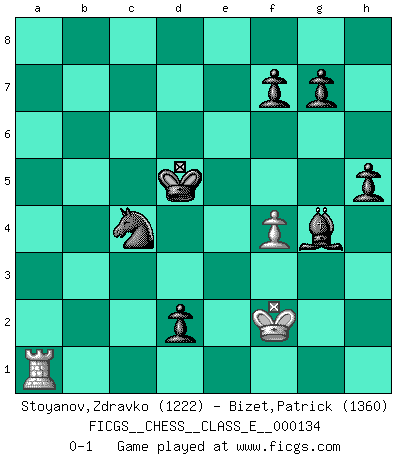 Last move : 0-1 2011 March 27 17:41:26 [Event "FICGS__CHESS__CLASS_E__000134"] [Site "FICGS"] [Date "2011.02.12"] [Round "1"] [White "Stoyanov,Zdravko"] [Black "Bizet,Patrick"] [Result "0-1"] [WhiteElo "1222"] [BlackElo "1360"] 1.e4 c5 2.Nf3 d6 3.h3 Nf6 4.c3 e6 5.a3 Nc6 6.Bb5 Bd7 7.O-O Nxe4 8.Re1 Nf6 9.b4 Be7 10.d4 cxd4 11.Nxd4 O-O 12.Bxc6 bxc6 13.Bg5 Qc7 14.Nd2 Rfe8 15.N2f3 Nd5 16.Bxe7 Rxe7 17.Qc2 c5 18.bxc5 Qxc5 19.Nb3 Qxc3 20.Qb1 Rb8 21.Ng5 Nf6 22.Re3 Qc4 23.Qd3 Qxd3 24.Rxd3 Ba4 25.Nd2 d5 26.Rd4 Be8 27.a4 Reb7 28.a5 a6 29.Rh4 Rb2 30.Ngf3 Rc2 31.Rd4 R8b2 32.Kh2 Kf8 33.Rd3 e5 34.Nxe5 Rxd2 35.Rxd2 Rxd2 36.f3 Bb5 37.Rc1 Nd7 38.Rc8+ Ke7 39.Nc6+ Kf6 40.Nb4 Bf1 41.Rc6+ Ke7 42.Nxa6 Rxg2+ 43.Kh1 Ra2 44.Kg1 Bxh3 45.Nb4 Rxa5 46.Rc2 Ne5 47.f4 Nc4 48.Nc6+ Kd6 49.Nxa5 Nxa5 50.Rh2 Bf5 51.Rh5 Ke6 52.Kf2 d4 53.Rh1 Nc4 54.Rd1 Kd5 55.Kg3 h5 56.Ra1 d3 57.Kf3 Bg4+ 58.Kf2 d2 0-1 Sicilian Kingside Castling by player White (move 7) Kingside Castling by player Black (move 11) 10 pieces endgame at move 49 : White KRP , Black KBNPPPP WHITE : King + 1 Rook 1 Pawn BLACK : King + 1 Bishop 1 Knight 4 Pawns Player Black won this chess game. Follow this game move after move (download)I believe that Chess possesses a magic that is also a help in advanced age. A rheumatic knee is forgotten during a game of Chess and other events can seem quite unimportant in comparison with a catastrophe on the chessboard. (Vlastimil Hort) Ivan Sokolov treibt mich als Beifahrer an mit go Loeky go - . (Loek van Wely) Bobby Fischer es el mas grande genio de Ajedrez de todos los tiempos. (Alexander Kotov) 'L'échange des dames est un coup dur pour les deux adversaires...' Un journaliste lors d'une partie du match Spassky-Fischer He who laughs last probably does not get the joke. (Unknown)