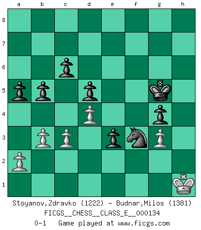 Last move : 0-1 2011 February 24 20:14:33 [Event "FICGS__CHESS__CLASS_E__000134"] [Site "FICGS"] [Date "2011.02.12"] [Round "1"] [White "Stoyanov,Zdravko"] [Black "Budnar,Milos"] [Result "0-1"] [WhiteElo "1222"] [BlackElo "1381"] 1.e4 e5 2.Bc4 Nf6 3.d3 c6 4.Bg5 h6 5.Bh4 g5 6.Bg3 d6 7.Nf3 Bg4 8.h3 Bh5 9.c3 Qe7 10.d4 Nxe4 11.Bh2 Bg7 12.O-O O-O 13.Be2 Bg6 14.Nbd2 b5 15.Bd3 Nxd2 16.Qxd2 Nd7 17.Bxg6 fxg6 18.Qd3 e4 19.Qe3 d5 20.Nd2 Rf7 21.Nb3 a5 22.Nd2 Nf6 23.Be5 g4 24.h4 h5 25.g3 Nh7 26.Bxg7 Kxg7 27.Nb3 Rf3 28.Qe1 g5 29.Nd2 Rd3 30.hxg5 Nxg5 31.Qd1 Nf3+ 32.Kg2 Nxd2 33.Rh1 Rh8 34.Rc1 Nf3 35.Qc2 h4 36.Rcd1 hxg3 37.fxg3 Rxh1 38.Kxh1 Rxd1 39.Qxd1 Kg6 40.Kg2 Qh7 41.Qh1 Qxh1 42.Kxh1 Kg5 43.b3 e3 0-1 Bishop's Opening : Berlin defense Kingside Castling by player White (move 12) Kingside Castling by player Black (move 12) Player Black won this chess game. Follow this game move after move (download)When you play Bobby, it is not a question if you win or lose. It is a question if you survive. (Boris Spassky) Du musst Deinen Gegner in einen tiefen dunklen Wald führen wo 2+2=5 ist und wo der Weg, der wieder hinausführt, nur breit genug für einen ist. (Mikhail Nekhemyevich Tal) Todos los jugadores de Ajedrez deberían tener un pasatiempo. (Savielly Tartakower) Mais l'homme est une créature légère et illogique : semblable au joueur d'échecs, il n'aime que le processus du but à atteindre, non le but lui-même. (Dostoïevsky) Never risk one's whole fortune unless supported by one's entire army. (Niccolo Machiavelli)