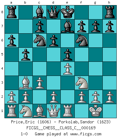 Last move : 1-0 2011 April 8 15:10:49 [Event "FICGS__CHESS__CLASS_C__000169"] [Site "FICGS"] [Date "2011.02.12"] [Round "1"] [White "Price,Eric"] [Black "Porkolab,Sandor"] [Result "1-0"] [WhiteElo "1606"] [BlackElo "1623"] 1.e4 e5 2.Nf3 Nc6 3.Bb5 a6 4.Ba4 Nf6 5.O-O Be7 6.Re1 b5 7.Bb3 d6 8.c3 1-0 This chess game has been lost on time (started : 2011.02.12 19:11:6) Ruy Lopez : Closed Kingside Castling by player White (move 5) Player White won this chess game. Follow this game move after move (download)As one by one I mowed them down, my superiority soon became apparent. (Jose Capablanca) Sitze auf Deine Hände. (Siegbert Tarrasch) El Ajedrez es parte de una cultura y si una cultura esta en decadencia, entonces también el Ajedrez declinará. (Mikhail Botvinnik) Même si vous avez un bon coup à faire, regardez toujours s'il n'y en a pas un qui lui soit préférable. (Pedro Damiano) If only people were all showed a certain minimum level of niceness; if only people didn't retract verbal draw offers (without draw box ticked) on ficgs; if only people didn't kill; if only people didn't run concentration / extermination camps, if only people didn't drop nuclear bombs on Hiroshima and Nagasaki, and so on - it would be a much more beautiful world. But sadly, things are not so... (Normajean Yates)