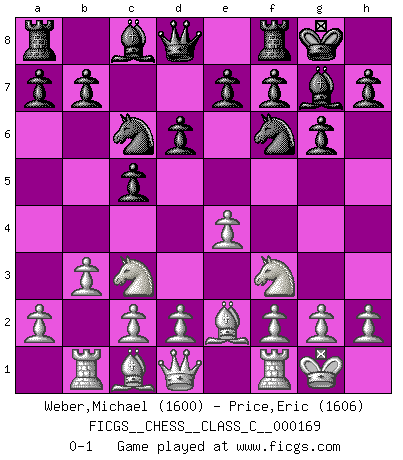Last move : 0-1 2011 April 3 14:37:25 [Event "FICGS__CHESS__CLASS_C__000169"] [Site "FICGS"] [Date "2011.02.12"] [Round "1"] [White "Weber,Michael"] [Black "Price,Eric"] [Result "0-1"] [WhiteElo "1600"] [BlackElo "1606"] 1.Nc3 Nf6 2.Nf3 c5 3.e4 d6 4.b3 Nc6 5.Be2 g6 6.O-O Bg7 7.Rb1 O-O 0-1 This chess game has been lost on time (started : 2011.02.12 19:11:6) Dunst (Sleipner, Heinrichsen) Opening Kingside Castling by player White (move 6) Kingside Castling by player Black (move 7) Player Black won this chess game. Follow this game move after move (download)Help your pieces so they can help you. (Paul Morphy) Im Blitz ist es einfacher mit einer Figur weniger anzugreifen, als sich mit einer Mehrfigur zu verteidigen. (Mikhail Nekhemyevich Tal) Mi estilo es algo parecido entre un poco de Tal y Petrosian. (Reshevsky) Le plus grand jeu de l'esprit jamais inventé, plus vous l'apprenez, plus vous y prenez du plaisir. (Garry Kasparov) If you ain't just a little scared when you enter a casino, you are either very rich or you haven't studied the games enough. (Pappy)