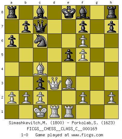 Last move : 1-0 2011 May 12 18:1:32 [Event "FICGS__CHESS__CLASS_C__000169"] [Site "FICGS"] [Date "2011.02.12"] [Round "1"] [White "Simashkevitch,Mykola"] [Black "Porkolab,Sandor"] [Result "1-0"] [WhiteElo "1800"] [BlackElo "1623"] 1.e4 c5 2.Nf3 d6 3.d4 cxd4 4.Nxd4 Nf6 5.Nc3 a6 6.Be3 e6 7.g4 e5 8.Nf5 g6 9.g5 gxf5 10.exf5 d5 11.gxf6 d4 12.Bc4 Qc7 13.Qd3 dxc3 14.O-O-O Nc6 15.Rhe1 1-0 This chess game has been lost on time (started : 2011.02.12 19:11:6) Sicilian : Najdorf, Byrne (English) attack Queenside Castling by player White (move 14) Player White won this chess game. Follow this game move after move (download)That's what Chess is all about. One day you give your opponent a lesson, the next day he gives you one. (Bobby Fischer) Die Auseinandersetzung mit Karpow war politisch geprägt. Er stand für das kommunistische System, wurde von dessen Repräsentanten gehätschelt. Ich war der Oppositionelle. Jeder Schachweltmeister spiegelt auch die gesellschaftlichen Verhältnisse wider. Kramnik steht für die Börsen-Generation des Neuen Markts, ideologiefrei, zahlenfixiert. (Garry Kasparov) Los Peones son el alma de una partida de Ajedrez. (Francois Andre Danican Philidor) C'est la seule position que je connaisse où les deux camps sont mals. Propos prêtés à V. Anand. Depression is just anger without enthusiasm. (Unknown)