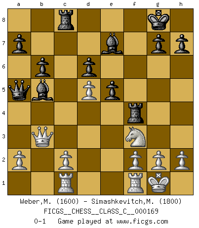 Last move : 0-1 2011 February 22 10:4:37 [Event "FICGS__CHESS__CLASS_C__000169"] [Site "FICGS"] [Date "2011.02.12"] [Round "1"] [White "Weber,Michael"] [Black "Simashkevitch,Mykola"] [Result "0-1"] [WhiteElo "1600"] [BlackElo "1800"] 1.e4 e5 2.Bc4 Nf6 3.Qe2 Nc6 4.Nf3 Be7 5.O-O O-O 6.Nc3 d6 7.Nd5 Na5 8.d4 Nxd5 9.Bxd5 c6 10.b4 cxd5 11.bxa5 dxe4 12.Qxe4 Qxa5 13.d5 Bd7 14.Bg5 f6 15.Bxf6 Rxf6 16.Rab1 Rf4 17.Qd3 b6 18.Qb3 Rc8 19.Rbc1 Bb5 0-1 Bishop's Opening : Berlin defense Kingside Castling by player White (move 5) Kingside Castling by player Black (move 5) Player Black won this chess game. Follow this game move after move (download)The Chess pieces are the block alphabet which shapes thoughts; and these thoughts, although making a visual design on the chessboard, express their beauty abstractly, like a poem. (Marcel Duchamp) Karpov ist ein Museumsstück. (Garry Kasparov) Una compensación adecuada por un sacrificio es tener una combinación sólida que conduce a una posición ganadora; una compensación adecuada por una metida de pata es dejar a tu oponente arrebatar una derrota de las fauces de la victoria. (Bruce A. Moon) Les échecs, c'est l'art d'analyser. (Mikhail Botvinnik) Live, lose, and learn, by observing your opponent how to win. (Amber Steenbock)