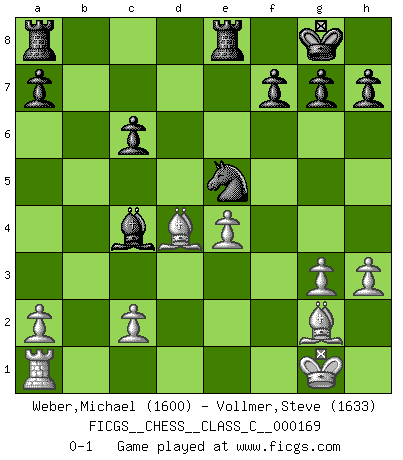 Last move : 0-1 2011 February 22 10:20:41 [Event "FICGS__CHESS__CLASS_C__000169"] [Site "FICGS"] [Date "2011.02.12"] [Round "1"] [White "Weber,Michael"] [Black "Vollmer,Steve"] [Result "0-1"] [WhiteElo "1600"] [BlackElo "1633"] 1.g3 e5 2.e4 Nc6 3.Ne2 Nf6 4.Nbc3 Bc5 5.f4 d6 6.fxe5 dxe5 7.d3 Ng4 8.d4 exd4 9.Bg2 dxc3 10.Qxd8+ Nxd8 11.bxc3 O-O 12.Nd4 Re8 13.O-O Ne6 14.Rf5 Bxd4+ 15.cxd4 Nxd4 16.Rc5 c6 17.Bb2 Ne6 18.Rc3 Nd4 19.Rc5 b6 20.Bxd4 bxc5 21.Bxc5 Ne5 22.h3 Ba6 23.Bd4 Bc4 0-1 Benko's Opening Kingside Castling by player Black (move 11) Kingside Castling by player White (move 13) Player Black won this chess game. Follow this game move after move (download)Later, I began to succeed in decisive games. Perhaps because I realized a very simple truth: not only was I worried, but also my opponent. (Mikhail Tal) Stil? Ich habe keinen Stil! (Anatoly Karpov) Un buen sacrificio es aquel que aunque no sea necesariamente sólido, deja a tu oponente aturdido y confuso. (Rudolph Spielmann) Karpov est une pièce de musée. (Garry Kasparov) Is not life a hundred times too short to bore ourselves ? (Friedrich Nietzsche)