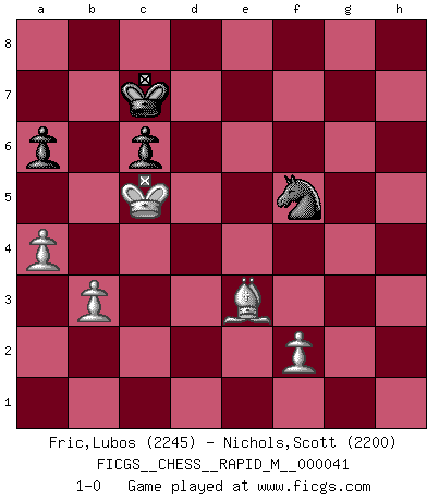 Last move : 1-0 2011 May 6 17:51:45 [Event "FICGS__CHESS__RAPID_M__000041"] [Site "FICGS"] [Date "2011.02.12"] [Round "1"] [White "Fric,Lubos"] [Black "Nichols,Scott"] [Result "1-0"] [WhiteElo "2245"] [BlackElo "2200"] 1.d4 Nf6 2.c4 h6 3.Nc3 e6 4.e4 Bb4 5.e5 Ne4 6.Qc2 d5 7.exd6 Nxd6 8.Nf3 O-O 9.Bd3 b6 10.O-O Bb7 11.Ne2 Bxf3 12.gxf3 Nf5 13.Be4 c6 14.Bxf5 exf5 15.Qxf5 Re8 16.Be3 Bf8 17.Rad1 Nd7 18.Ng3 Qc8 19.Kg2 Nf6 20.Qxc8 Raxc8 21.b3 Rcd8 22.Rd3 g6 23.h4 Kh7 24.Rh1 Re6 25.a4 Rd7 26.f4 R6e7 27.h5 Kg8 28.Bc1 Bg7 29.Rhd1 Kh7 30.hxg6+ fxg6 31.f5 Re8 32.fxg6+ Kxg6 33.Rf3 Ne4 34.Nf5 Re6 35.Rh1 h5 36.Ng3 Bxd4 37.Rxh5 Rh7 38.Rxh7 Kxh7 39.Rf4 Nxg3 40.Rxd4 Nf5 41.Rd7+ Re7 42.Rxe7+ Nxe7 43.c5 bxc5 44.Ba3 a6 45.Bxc5 Nf5 46.Kf3 Kg6 47.Ke4 Kf6 48.Kd3 Ke6 49.Kc4 Kd7 50.Be3 Kc7 51.Kc5 1-0 Queen's pawn game Kingside Castling by player Black (move 8) Kingside Castling by player White (move 10) 10 pieces endgame at move 43 : White KBPPP , Black KNPPP WHITE : King + 1 Bishop 3 Pawns BLACK : King + 1 Knight 3 Pawns 9 pieces endgame at move 45 : White KBPPP , Black KNPP WHITE : King + 1 Bishop 3 Pawns BLACK : King + 1 Knight 2 Pawns Player White won this chess game. Follow this game move after move (download)Whoever sees no other aim in the game than that of giving checkmate to one's opponent will never become a good Chess player. (Euwe) Heutzutage gewinnt im Turnier nicht derjenige Spieler, der weitreichende Pläne entwirft, sondern einfach jener, der Zug um Zug kämpft. (David Bronstein) La última cosa en que Fischer estaba interesado era en tonterías, siempre y cuando el Ajedrez estuviera involucrado. (Elie Agur) Même si vous avez un bon coup à faire, regardez toujours s'il n'y en a pas un qui lui soit préférable. (Pedro Damiano) For peace of mind, resign as general manager of the universe. (Douglas Adams)