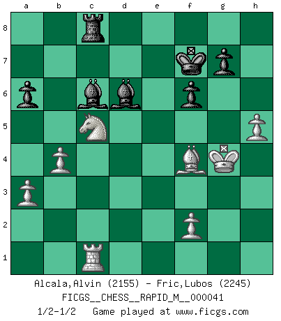 Last move : 1/2-1/2 2011 July 6 22:25:56 [Event "FICGS__CHESS__RAPID_M__000041"] [Site "FICGS"] [Date "2011.02.12"] [Round "1"] [White "Alcala,Alvin"] [Black "Fric,Lubos"] [Result "1/2-1/2"] [WhiteElo "2155"] [BlackElo "2245"] 1.e4 c5 2.Nf3 d6 3.d4 cxd4 4.Nxd4 Nf6 5.Nc3 a6 6.h3 e6 7.g4 d5 8.Nde2 Bb4 9.a3 Ba5 10.b4 Bb6 11.Bg2 O-O 12.O-O Nc6 13.exd5 Nxd5 14.Nxd5 exd5 15.Qxd5 Qxd5 16.Bxd5 h5 17.gxh5 Bxh3 18.Re1 Rad8 19.Nf4 Nd4 20.Re7 Nxc2 21.Ra2 Nd4 22.Bxb7 Bc8 23.Bg2 Nf5 24.Re1 Nh4 25.Bh1 Bg4 26.Kh2 Nf3+ 27.Bxf3 Bxf3 28.Kg3 Ba8 29.Rc2 Rc8 30.Rxc8 Rxc8 31.Be3 Bc7 32.Rc1 Bc6 33.Kg4 Bd6 34.Nd3 f6 35.Nc5 Kf7 36.Bf4 1/2-1/2 Sicilian : Najdorf, Adams attack Kingside Castling by player Black (move 11) Kingside Castling by player White (move 12) This chess game ended in a draw. Follow this game move after move (download)The King is a fighting piece. Use it ! (Wilhelm Steinitz) Der Knackpunkt bei der Konzentration ist, daß wir nur durch sie etwas Neues und Ungewöhnliches am Schachbrett finden können. Sie ist der einzige Weg durch neue neue Ideen eine Überraschung zu bereiten. (Garry Kasparov) Si tu oponente te ofrece un empate, trata de averiguar porque piensa él que esta en una posición peor. (Nigel Short) La tactique est l'élément le plus important du milieu de jeu. (Siegbert Tarrasch) He who is a good ruler must first have been ruled. (Aristotle)