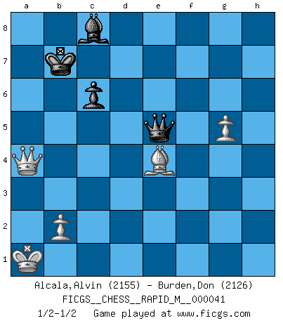 Last move : 1/2-1/2 2011 September 1 23:31:56 [Event "FICGS__CHESS__RAPID_M__000041"] [Site "FICGS"] [Date "2011.02.12"] [Round "1"] [White "Alcala,Alvin"] [Black "Burden,Don"] [Result "1/2-1/2"] [WhiteElo "2155"] [BlackElo "2126"] 1.e4 c5 2.Nf3 d6 3.d4 cxd4 4.Nxd4 Nf6 5.Nc3 g6 6.Be3 Bg7 7.f3 O-O 8.Qd2 Nc6 9.O-O-O d5 10.exd5 Nxd5 11.Nxc6 bxc6 12.Bd4 Bxd4 13.Qxd4 Qb6 14.Na4 Qc7 15.Bc4 Rd8 16.Bb3 Bf5 17.Nc5 Nb6 18.Qc3 h5 19.g3 e6 20.Rhe1 Rac8 21.a3 Nd5 22.Qc4 Qe7 23.Qd4 Qf8 24.Qf2 Qe7 25.Kb1 Rb8 26.Ka1 Kg7 27.Qd4+ f6 28.Qg1 e5 29.c4 Nb6 30.g4 hxg4 31.fxg4 Rxd1+ 32.Rxd1 Bc8 33.Ba2 f5 34.h3 a5 35.Bb1 f4 36.Qe1 Qxc5 37.Qe4 Nd7 38.Qxg6+ Kf8 39.Bf5 Rb7 40.h4 Qf2 41.Qh6+ Ke7 42.Qg7+ Kd8 43.Qxe5 f3 44.Qxa5+ Rb6 45.Rd2 Qe3 46.c5 f2 47.Rxf2 Qxf2 48.cxb6 Nxb6 49.Bb1 Kc7 50.h5 Qh2 51.a4 Qf4 52.g5 Kb7 53.h6 Nxa4 54.h7 Qd4 55.h8Q Qxh8 56.Qxa4 Qe5 57.Be4 1/2-1/2 Sicilian : Dragon, Yugoslav attack, 7...O-O Kingside Castling by player Black (move 7) Queenside Castling by player White (move 9) Promotion Queen by player White (move 55) 10 pieces endgame at move 55 : White KQBPP , Black KQBNP WHITE : King + 1 Queen 1 Bishop 2 Pawns BLACK : King + 1 Queen 1 Bishop 1 Knight 1 Pawn 9 pieces endgame at move 56 : White KQBPP , Black KQBP WHITE : King + 1 Queen 1 Bishop 2 Pawns BLACK : King + 1 Queen 1 Bishop 1 Pawn This chess game ended in a draw. Follow this game move after move (download)It is the aim of the modern school, not to treat every position according to one general law, but according to the principle inherent in the position. (Richard Reti) Wer sich die Fähigkeit anerziehen will im Schach selbstständig zu denken, der muß alles meiden, was leblos ist: ausgeklügelte Theorien, die sich auf sehr wenige Beispiele und eine Menge Hirngespinste stützen. (Emanuel Lasker) Por esta medida (el intervalo entre Fischer y sus contemporaneos), yo le considero el mas grande campeón mundial. (Garry Kasparov) L'ordinateur a tué l'originalité. Il n'y a plus guère d'aventures sur l'échiquier. (Jacob Murray) Either move or be moved. (Ezra Pound)
