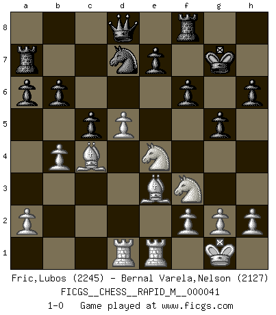 Last move : 1-0 2011 May 19 7:15:48 [Event "FICGS__CHESS__RAPID_M__000041"] [Site "FICGS"] [Date "2011.02.12"] [Round "1"] [White "Fric,Lubos"] [Black "Bernal Varela,Nelson"] [Result "1-0"] [WhiteElo "2245"] [BlackElo "2127"] 1.d4 Nf6 2.c4 g6 3.Nf3 Bg7 4.Nc3 d5 5.Qb3 dxc4 6.Qxc4 O-O 7.e4 b6 8.e5 Be6 9.exf6 Bxc4 10.fxg7 Kxg7 11.Bxc4 c6 12.O-O a6 13.Bf4 h6 14.Rfe1 Nd7 15.Rad1 Ra7 16.d5 c5 17.Ne4 f6 18.b4 g5 19.Be3 1-0 King's Indian, 3.Nf3 Kingside Castling by player Black (move 6) Kingside Castling by player White (move 12) Player White won this chess game. Follow this game move after move (download)Fischer is the strongest player in the world. In fact, the strongest player who ever lived. (Larry Evans) Schach ist wie eine schöne Frau, zu der wir ständig zurückkehren, gleichviel, wie oft sie uns zurückweist. (Anonymous) El arma más poderosa en el Ajedrez, es tener la próxima movida. (David Bronstein) 'L'échange des dames est un coup dur pour les deux adversaires...' Un journaliste lors d'une partie du match Spassky-Fischer Follow your passion, and success will follow you. (Arthur Buddhold)