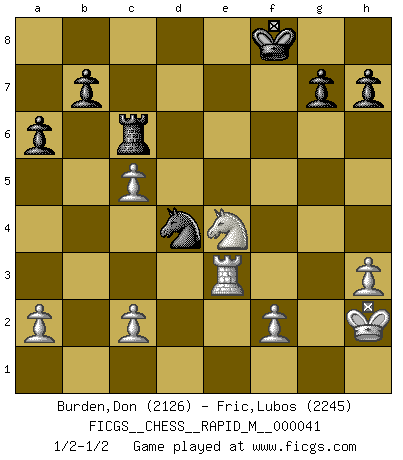 Last move : 1/2-1/2 2011 July 1 19:8:11 [Event "FICGS__CHESS__RAPID_M__000041"] [Site "FICGS"] [Date "2011.02.12"] [Round "1"] [White "Burden,Don"] [Black "Fric,Lubos"] [Result "1/2-1/2"] [WhiteElo "2126"] [BlackElo "2245"] 1.e4 c5 2.Nf3 d6 3.d4 cxd4 4.Nxd4 Nf6 5.Nc3 a6 6.h3 e6 7.g4 d5 8.exd5 Nxd5 9.Nde2 Bb4 10.Bg2 O-O 11.O-O Bxc3 12.bxc3 Qc7 13.Bxd5 exd5 14.Qxd5 Be6 15.Bf4 Bxd5 16.Bxc7 Nc6 17.Ng3 Rac8 18.Rfd1 Rxc7 19.Rxd5 Ne7 20.Rd3 Ng6 21.Ne4 f5 22.gxf5 Rxf5 23.Rd8+ Rf8 24.Rxf8+ Kxf8 25.Re1 Nf4 26.Kh2 Rc6 27.c4 Ne6 28.Re3 Nd4 29.c5 1/2-1/2 Sicilian : Najdorf, Adams attack Kingside Castling by player Black (move 10) Kingside Castling by player White (move 11) This chess game ended in a draw. Follow this game move after move (download)The combination player thinks forward; he starts from the given position, and tries the forceful moves in his mind. (Emanuel Lasker) Wie gewinnt Tal? Er entwickelt alle seine Figuren in die Brettmitte und opfert sie dann irgendwo. (Robert James Fischer) Tu sabes que vas a perder. Aún cuando tenía la ventaja, yo sabía que iba a perder. - al estar jugando con Fischer (Andrew Soltis) La vie est comme un jeu d'échecs : nous esquissons un plan, mais celui-ci est tributaire de ce que daignent faire l'adversaire aux échecs et le destin dans la vie. (Arthur Schopenhauer) Over-the-board chess is the favorite of mortals, correspondence chess is the favorite of the gods. (Eduard Dyckhoff)