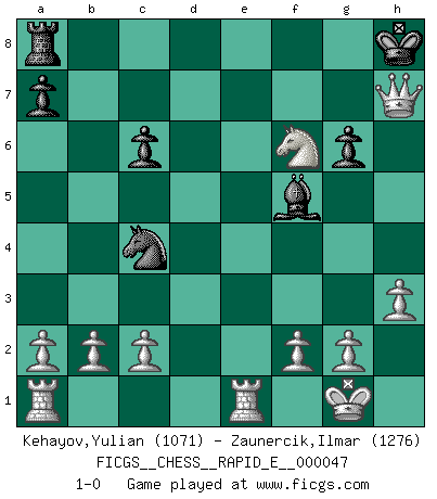 Last move : 1-0 2011 March 14 10:1:48 [Event "FICGS__CHESS__RAPID_E__000047"] [Site "FICGS"] [Date "2011.02.15"] [Round "1"] [White "Kehayov,Yulian"] [Black "Zaunercik,Ilmar"] [Result "1-0"] [WhiteElo "1071"] [BlackElo "1276"] 1.e4 c5 2.Nf3 d6 3.Nc3 Nc6 4.Bc4 Nf6 5.d4 cxd4 6.Nxd4 g6 7.O-O Bg7 8.Nxc6 bxc6 9.e5 Ng4 10.exd6 Be5 11.h3 Nf6 12.dxe7 Qxe7 13.Re1 O-O 14.Bf4 Nd7 15.Bxe5 Nxe5 16.Qd4 Qb4 17.Bxf7+ Rxf7 18.Qxb4 Re7 19.Qxe7 Nc4 20.Ne4 Bf5 21.Nf6+ Kh8 22.Qxh7+ 1-0 Sicilian Kingside Castling by player White (move 7) Kingside Castling by player Black (move 13) Player White won this chess game. Follow this game move after move (download)Bobby is the most misunderstood, misquoted celebrity walking the face of this earth. (Yasser Seirawan) Ohne Fehler kann es keine Brillanz geben. (Emanuel Lasker) El Ajedrez es despiadado: debes de estar preparado para matar gente. (Nigel Short) Assurément je connaissais par expérience le mystérieux attrait de ce jeu royal, le seul entre tous les jeux inventés par les hommes qui échappe souverainement à la tyrannie du hasard, le seul où l'on ne doive sa victoire qu'à son intelligence ou plutôt à une certaine forme d'intelligence. Mais n'est-ce pas déjà le limiter injurieusement que d'appeler les échecs un jeu ? N'est-ce pas une science, un art ou quelque chose qui, comme le cercueil de Mahomet entre ciel et terre, est suspendu entre l'un et l'autre, et qui réunit un nombre incroyable de contraires ? [...] C'est une pensée qui ne mène à rien, une mathématique qui n'établit rien, un art qui ne laisse pas d'uvre, une architecture sans matière; et il l'a prouvé néanmoins qu'il était plus durable, à sa manière, que les livres ou que tout autre monument, ce jeu unique qui appartient à tous les peuples et à tous les temps, et dont personne ne sait quel dieu en fit don à la terre pour tuer l'ennui, pour aiguiser l'esprit et stimuler l'âme. Où commence-t-il, où finit-il ? (Stefan Zweig) May the force be with you. (Han Solo in Star Wars ep.4)