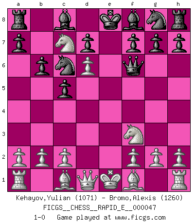 Last move : 1-0 2011 March 2 15:46:29 [Event "FICGS__CHESS__RAPID_E__000047"] [Site "FICGS"] [Date "2011.02.15"] [Round "1"] [White "Kehayov,Yulian"] [Black "Bromo,Alexis"] [Result "1-0"] [WhiteElo "1071"] [BlackElo "1260"] 1.e4 c5 2.Nf3 Nc6 3.Nc3 e6 4.d4 b6 5.d5 exd5 6.exd5 Nce7 7.d6 Nc6 8.Nb5 Qf6 9.Nc7+ 1-0 Sicilian defense Player White won this chess game. Follow this game move after move (download)In Chess, just as in life, today's bliss may be tomorrow's poison. (Assaic) Mit sehr nachdenklichem Gesicht schreitet Bobby durch den Turniersaal. Was ist passiert?, fragt Lombardy. Ich stehe schlecht, antwortet Fischer. Lombardy: Dann biete doch einfach Remis an. Fischer: So schlecht stehe ich nun auch wieder nicht! (Robert James Fischer) Con el tiempo, empecé a progresar en partidas decisivas. Tal vez porque me di cuenta de una simple verdad: no solo estaba yo nervioso sino también mi oponente. (Mikhail Tal) Les Echecs ont trois composantes : le temps, l'espace et le matériel en dernier. (Mikhail Tal) Is not life a hundred times too short to bore ourselves ? (Friedrich Nietzsche)