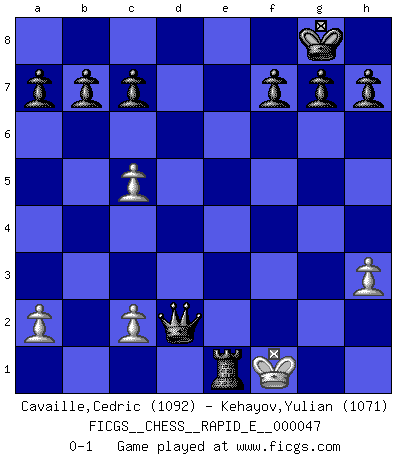 Last move : 0-1 2011 March 1 17:28:20 [Event "FICGS__CHESS__RAPID_E__000047"] [Site "FICGS"] [Date "2011.02.15"] [Round "1"] [White "Cavaille,Cedric"] [Black "Kehayov,Yulian"] [Result "0-1"] [WhiteElo "1092"] [BlackElo "1071"] 1.e4 e5 2.Nf3 Nc6 3.Bc4 Nf6 4.d4 exd4 5.Nxd4 Nxe4 6.O-O d5 7.Bxd5 Qxd5 8.Be3 Bd6 9.Nc3 Nxc3 10.bxc3 O-O 11.Nxc6 Qxc6 12.Qd4 Rd8 13.c4 Bxh2+ 14.Kxh2 Rxd4 15.Bxd4 Qd6+ 16.Kg1 Qxd4 17.Rfd1 Qf6 18.Rd2 Qxa1+ 19.Kh2 Qe5+ 20.f4 Qxf4+ 21.Kg1 Qxd2 22.c5 Bh3 23.gxh3 Re8 24.Kf1 Re1+ 0-1 Two knights defense Kingside Castling by player White (move 6) Kingside Castling by player Black (move 10) Player Black won this chess game. Follow this game move after move (download)The game of Chess is not merely an idle amusement; several very valuable qualities of the mind are to be acquired and strengthened by it, so as to become habits ready on all occasions; for life is a kind of Chess. (Benjamin Franklin) Herr Iljumschinow ist ein etwas merkwürdiger Geschäftsmann: Er arbeitet zusammen mit Leuten wie Muammar al-Gaddafi; früher ist das Saddam Hussein gewesen. (Joel Lautier) Todos los Maestros de Ajedrez fueron un día unos principiantes. (Chernev) Psychologiquement, tu dois avoir confiance en toi même, mais cette confiance doit être basée sur des faits. (Robert Fischer) I can't decide which is riskier; taking crazy risks, or taking advice on crazy risks from a crazy risk taker. (Gregory House in House M.D.)