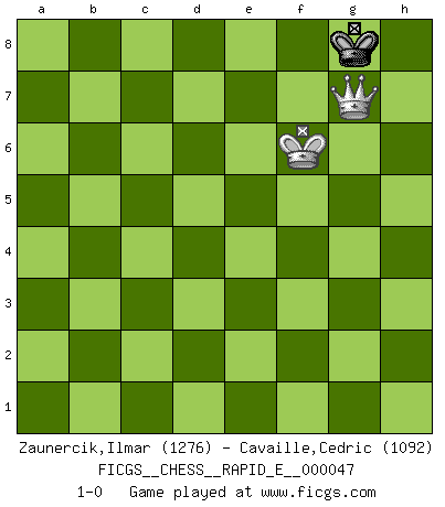 Last move : 1-0 2011 April 16 23:30:14 [Event "FICGS__CHESS__RAPID_E__000047"] [Site "FICGS"] [Date "2011.02.15"] [Round "1"] [White "Zaunercik,Ilmar"] [Black "Cavaille,Cedric"] [Result "1-0"] [WhiteElo "1276"] [BlackElo "1092"] 1.e4 c5 2.Nf3 d6 3.d4 cxd4 4.Nxd4 Nc6 5.Nc3 Nf6 6.Bc4 Nxd4 7.Qxd4 Qb6 8.Qxb6 axb6 9.O-O e6 10.Bg5 h6 11.Bh4 Be7 12.Rad1 d5 13.exd5 exd5 14.Nxd5 Nxd5 15.Rfe1 Be6 16.Bxe7 Nxe7 17.Bxe6 fxe6 18.Rxe6 Rd8 19.Rde1 Rd7 20.Rxb6 g5 21.a4 Rg8 22.a5 Kf7 23.Rxh6 Rg6 24.Rh7+ Rg7 25.Rh3 Rd2 26.Rc3 Nc6 27.Rc5 Rg6 28.h3 Rgd6 29.Kf1 Rd1 30.Rxd1 Rxd1+ 31.Ke2 Ra1 32.Rxg5 Rxa5 33.Rxa5 Nxa5 34.g4 Nc6 35.c3 Kf6 36.f4 b5 37.h4 Na5 38.h5 Nc4 39.g5+ Kf5 40.h6 Nd6 41.Ke3 Nc4+ 42.Kd4 Nd6 43.Kc5 Nf7 44.Kxb5 Kxf4 45.c4 Kxg5 46.c5 Nxh6 47.c6 Nf7 48.Kb6 Kf6 49.b4 Ke6 50.b5 Nd6 51.Kc5 Ne4+ 52.Kb6 Nd6 53.Ka6 Ne8 54.b6 Nd6 55.b7 Nxb7 56.cxb7 Kd7 57.b8Q Kc6 58.Qb5+ Kd6 59.Kb6 Ke6 60.Qd3 Ke5 61.Kc6 Ke6 62.Qd5+ Ke7 63.Qd6+ Ke8 64.Qd7+ Kf8 65.Kd6 Kg8 66.Ke6 Kh8 67.Kf6 Kg8 68.Qg7+ 1-0 Sicilian Kingside Castling by player White (move 9) 10 pieces endgame at move 33 : White KRPPPPP , Black KNP WHITE : King + 1 Rook 5 Pawns BLACK : King + 1 Knight 1 Pawn 9 pieces endgame at move 33 : White KPPPPP , Black KNP WHITE : King + 5 Pawns BLACK : King + 1 Knight 1 Pawn 8 pieces endgame at move 44 : White KPPPPP , Black KN WHITE : King + 5 Pawns BLACK : King + 1 Knight 7 pieces endgame at move 44 : White KPPPP , Black KN WHITE : King + 4 Pawns BLACK : King + 1 Knight 6 pieces endgame at move 45 : White KPPP , Black KN WHITE : King + 3 Pawns BLACK : King + 1 Knight 5 pieces endgame at move 46 : White KPP , Black KN WHITE : King + 2 Pawns BLACK : King + 1 Knight 4 pieces endgame at move 55 : White KP , Black KN WHITE : King + 1 Pawn BLACK : King + 1 Knight 3 pieces endgame at move 56 : White KP , Black K WHITE : King + 1 Pawn BLACK : King + Promotion Queen by player White (move 57) Player White won this chess game. Follow this game move after move (download)It is difficult to play against Einstein's theory --on his first loss to Fischer. (Mikhail Tal) Wenn man heute mit 14 Jahren noch kein GM ist, kann man es vergessen. (Viswanathan Anand) Te sientas frente a un tablero y repentinamente tu corazón brinca. Tu mano tiembla al tomar una pieza y moverla. Pero lo que el Ajedrez te enseña es que tu debes permanecer ahí con calma y pensar de que si realmente es una buena idea o de que si hay otras ideas mejores. (Stanley Kubrick) Les Echecs ne sont pas pour les âmes timides. Ils requièrent un homme entier, qui ne s'arrête pas aveuglément à ce qui a été déjà établi, mais qui tente individuellement de sonder les profondeurs du jeu. (W. Steinitz) Wisdom doesn't necessarily come with age. Sometimes age just shows up all by itself. (Tom Watson)