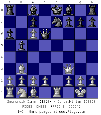 Last move : 1-0 2011 April 12 3:27:44 [Event "FICGS__CHESS__RAPID_E__000047"] [Site "FICGS"] [Date "2011.02.15"] [Round "1"] [White "Zaunercik,Ilmar"] [Black "Jerez,Miriam"] [Result "1-0"] [WhiteElo "1276"] [BlackElo "0997"] 1.e4 e5 2.Nf3 Nc6 3.Bb5 Nge7 4.O-O a6 5.Ba4 b5 6.Bb3 d5 7.exd5 e4 8.dxc6 exf3 9.Qxf3 Qd6 10.Re1 1-0 This chess game has been lost on time (started : 2011.02.15 1:14:34) Ruy Lopez : Cozio defense Kingside Castling by player White (move 4) Player White won this chess game. Follow this game move after move (download)Only sissies Castle. (Rob Sillars) Im Fernschach kannst du während dem Spiel rauchen. (John Christen Knudsen) Debemos de asegurarnos de que el Ajedrez no se convierta en un lenguaje muerto, muy interesante, pero tan solo para un grupo muy pequeño. (Sytze Faber) Si le désir cupide (et stupide) de gagner est une inépuisable source de souffrance, une combinaison brillante sur l'échiquier est une découverte : le coquelicot qui s'épanouit lorsque apparaît la Voie Lactée. (Arrabal) The various flowers seem good to different people. (Chinese proverb)