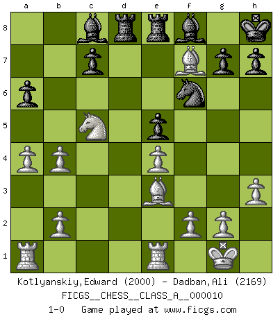 Last move : 1-0 2006 December 23 22:0:22 [Event "FICGS__CHESS__CLASS_A__000010"] [Site "FICGS"] [Date "2006.12.06"] [Round "1"] [White "Kotlyanskiy,Edward"] [Black "Dadban,Ali"] [Result "1-0"] [WhiteElo "2000"] [BlackElo "2169"] 1.e4 e5 2.Nf3 Nc6 3.Bb5 a6 4.Ba4 Nf6 5.O-O Be7 6.Re1 b5 7.Bb3 d6 8.c3 O-O 9.h3 Bb7 10.d4 Re8 11.Nbd2 Bf8 12.a4 Na5 13.Ba2 b4 14.Ng5 Re7 15.dxe5 dxe5 16.cxb4 Nc6 17.Qb3 Nd4 18.Nxf7 Nxb3 19.Nxd8 Rxd8 20.Nxb3 Kh8 21.Nc5 Bc8 22.Be3 R7e8 23.Bf7 1-0 Ruy Lopez : Closed Kingside Castling by player White (move 5) Kingside Castling by player Black (move 8) Player White won this chess game. Follow this game move after move (download)Chess is a sea in which a gnat may drink and an elephant may bathe. (Hindu proverb) Ich glaube nicht an Psychologie, ich glaube an gute Züge. (Robert James Fischer) A través de las casillas del tablero, los Indios explican el movimiento del tiempo y la edad, las influencias mas altas que controlan el mundo y los lazos que vinculan al Ajedrez con el alma humana. (Al-Masudi) La solitude du joueur d'Echecs à l'approche du mat est semblable à celle du condamné. (Francis Szpiner) Plans are ideas that never come to fruition. (Daniel Parmet)