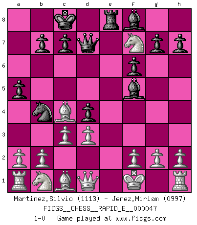 Last move : 1-0 2011 April 5 14:40:1 [Event "FICGS__CHESS__RAPID_E__000047"] [Site "FICGS"] [Date "2011.02.15"] [Round "1"] [White "Martinez,Silvio"] [Black "Jerez,Miriam"] [Result "1-0"] [WhiteElo "1113"] [BlackElo "0997"] 1.e4 d5 2.e5 Nc6 3.Nf3 d4 4.Bc4 Nf6 5.Ng5 Bf5 6.Nxf7 Qd7 7.Nxh8 Nb4 8.d3 O-O-O 9.Nf7 Re8 10.exf6 exf6 11.Kf1 a5 12.c3 1-0 This chess game has been lost on time (started : 2011.02.15 1:14:34) Scandinavian (centre counter) defense Queenside Castling by player Black (move 8) Player White won this chess game. Follow this game move after move (download)You must take your opponent into a deep dark forest where 2+2=5, and the path leading out is only wide enough for one. (Mikhail Tal) Wer wird heute Abend ihr Gegner sein? -- Heute Abend spiele ich gegen die schwarzen Steine. (Akiba Rubinstein) El Ajedrez es tortura mental. (Garry Kasparov) La vie et les Echecs sont tous les deux une lutte constante. (Lasker) Internet: Absolute communication, absolute isolation. (Paul Carvel)