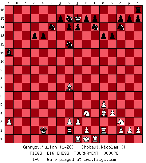 Last move : 1-0 2011 September 1 10:12:42 [Event "FICGS__BIG_CHESS__TOURNAMENT__000076"] [Site "FICGS"] [Date "2011.02.15"] [Round "1"] [White "Kehayov,Yulian"] [Black "Chobaut,Nicolas"] [Result "1-0"] [WhiteElo "1426"] [BlackElo ""] 1.j2-h4 m15-m13 2.h1-o7 p16-o14 3.o7-f15 g16-f14 4.f15-c12 d15-d13 5.c12-c15 b16-c14 6.c15-l7 j15-k13 7.e2-e4 h16-m12 8.n2-n4 l16-o13 9.d2-d4 n15-n13 10.p1-o3 m16-m14 11.m2-m4 m14-l14 12.l7-f7 k13-h12 13.g1-j2 c16-j10 14.f7-b7 e16-c16 15.a2-a3 l14-l2 16.l1-n3 m12-d4 17.c1-j7 d4-f2 18.e1-e2 f2-f12 19.b7-b15 a16-b16 20.b15-a14 l2-l8 21.m4-m5 o16-d6 22.g2-g3 j10-c4 23.e2-e1 c14-b12 24.a14-j6 l8-d8 25.f1-c4 c16-c4 26.b1-c3 b12-c10 27.j7-a15 b16-b2 28.c3-d5 c4-c2 29.d5-f4 d6-f4 30.g3-f4 d8-d2 31.h4-f3 o13-p12 32.j2-k4 p12-j6 33.o1-j6 f12-f4 34.e1-h1 e15-e13 35.a15-h8 b2-b3 36.h8-e5 f4-e4 37.a1-f1 f16-a11 38.m1-m3 c10-d8 39.k4-h5 b3-f3 40.f1-f3 e4-e5 41.j1-j2 d8-e6 42.h5-k4 e6-g5 43.f3-f1 g5-e4 44.j6-h7 e4-g3 45.j2-j1 c2-b2 46.m3-m2 g3-f1 47.h1-f1 d2-h2 48.k1-h2 b2-h2 49.j1-k1 e5-e2 50.f1-j1 k16-l14 51.q1-l1 j16-j15 52.n3-m4 1-0 This big chess game has been lost on time (started : 2011.02.15 1:15:14) Follow this game move after move (download)Via the squares on the chessboard, the Indians explain the movement of time and the age, the higher influences which control the world and the ties which link Chess with the human soul. (Al-Masudi) Schach ist die gewalttätigste aller Sportarten. (Garry Kasparov) El Ajedrez es un expediente tonto que hace creer a la gente inactiva que hacen una cosa muy astuta cuando solamente estan perdiendo su tiempo. (George Bernard Shaw) Donnez-moi un Cavalier en 6e et je gagnerais toutes mes parties. (Steinitz) A specialist learns more and more about less and less until he knows everything about nothing. (Nicholas Murray Butler)
