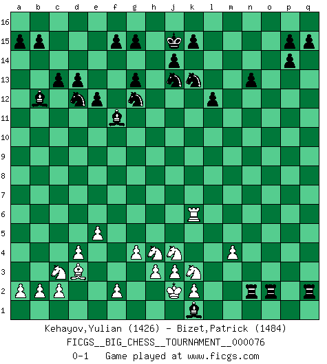 Last move : 0-1 2011 March 31 18:0:6 [Event "FICGS__BIG_CHESS__TOURNAMENT__000076"] [Site "FICGS"] [Date "2011.02.15"] [Round "1"] [White "Kehayov,Yulian"] [Black "Bizet,Patrick"] [Result "0-1"] [WhiteElo "1426"] [BlackElo "1484"] 1.g2-g4 m15-m13 2.h1-c6 e15-e13 3.d2-d4 g16-f14 4.n2-n4 p16-o14 5.m2-m4 b16-c14 6.e2-e4 n15-n13 7.l1-o4 j15-k13 8.c1-k8 d15-d13 9.f1-c4 h15-g13 10.o1-g8 l15-l13 11.m1-m3 l16-o13 12.b1-c3 f16-b12 13.j2-h4 c16-h11 14.c6-d5 k16-l14 15.p1-o3 l13-l12 16.g1-j2 o16-j11 17.h2-j4 c14-d12 18.k1-h2 c15-c13 19.j2-k4 h16-p9 20.o4-p3 e13-e12 21.j1-j2 q16-n16 22.m3-l3 l14-j13 23.l3-l6 o13-j8 24.l6-j6 j8-n4 25.q1-n1 n4-f11 26.o3-q4 p9-q9 27.h2-k3 j11-q4 28.p3-q4 q9-q4 29.k8-p3 q4-l9 30.e1-e2 f11-p2 31.k4-m3 l9-l2 32.n1-n3 l2-l9 33.m3-l5 p2-f11 34.a1-c1 l9-c1 35.d5-a5 c1-m10 36.a5-g5 m10-g5 37.j4-g5 f14-g12 38.n3-n7 n16-n14 39.e2-e3 o14-n12 40.g8-h7 j16-j15 41.p3-f12 n14-q14 42.f12-g13 h14-g13 43.o2-o4 q14-q2 44.o4-o5 m16-m14 45.n7-p7 m14-p14 46.p7-p14 o15-p14 47.e4-e5 e16-o16 48.c4-d3 o16-o5 49.h7-n12 m13-n12 50.d3-n12 o5-o2 51.g5-j4 o2-n2 52.n12-d3 a16-o16 53.e3-e1 o16-o2 54.e1-k1 h11-o5 55.l5-m3 o5-m3 56.j6-k6 m3-k1 0-1 Follow this game move after move (download)It's just you and your opponent at the board and you're trying to prove something. (Bobby Fischer) Ich rechne überhaupt nicht voraus. Ich gewinne auch so. (Robert James Fischer) Muchos jugadores de Ajedrez se sorprendían cuando después de la partida, Fischer explicaba con calma: 'Yo ya había analizado esta posibilidad' en una posición en la cual yo creía que no era posible de prever desde la apertura. (Mikhail Tal) Un footballeur joue avec ses pieds, parfois avec sa tête. Un joueur d'échecs ne joue qu'avec sa tête. Et quand il ne joue plus, il meurt. (Jacob Murray) Only sick music makes money today. (Friedrich Nietzsche)