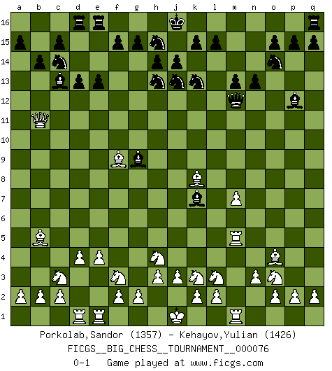 Last move : 0-1 2011 April 16 3:55:44 [Event "FICGS__BIG_CHESS__TOURNAMENT__000076"] [Site "FICGS"] [Date "2011.02.15"] [Round "1"] [White "Porkolab,Sandor"] [Black "Kehayov,Yulian"] [Result "0-1"] [WhiteElo "1357"] [BlackElo "1426"] 1.j2-h4 j15-h13 2.h1-o7 p16-o14 3.p1-o3 m15-m13 4.b1-c3 h16-l13 5.k1-l3 n15-n13 6.e2-e4 e15-e13 7.m2-m4 d15-d13 8.d2-d4 f16-c13 9.l1-o4 l13-m12 10.g1-f3 o16-g9 11.n2-n3 c16-l8 12.c1-k8 b16-c14 13.f1-b5 l16-p12 14.o1-f9 m16-m14 15.m4-m5 m14-k14 16.h2-k3 k14-k11 17.o7-k11 g16-j15 18.k11-b11 b15-b14 19.a1-d1 a16-d16 20.m5-m6 h15-j13 21.m1-m5 k16-h15 22.q1-m1 j15-k13 23.m6-m7 l8-k7 0-1 This big chess game has been lost on time (started : 2011.02.15 1:15:14) Follow this game move after move (download)The older I grow, the more I value pawns. (Paul Keres) Die starken Figuren des Gegners muss man abtauschen. (José Raúl Capablanca) Una partida de Ajedrez se divide en 3 etapas: la primera cuando piensas que tienes la ventaja, la segunda cuando crees que tienes la ventaja y la tercera... ¡cuando te das cuenta que vas a perder!. (Savielly Tartakower) Dans le domaine de la peinture, de la gravure et de la sculpture, dès la première décennie de notre siècle, les artistes abandonnent la représentation de la partie d'échecs pour se concentrer sur les pièces, sur les échiquiers et sur toutes les variations auxquelles les unes et les autres peuvent donner lieu. On passe en quelque sorte d'un thème social à un thème musical (au sens de la musica médiévale, c'est-à-dire d'une notion qui inclue le rythme, l'harmonie, la construction et la déconstruction, etc.). Graphiquement et picturalement, l'échiquier apparaît comme une structure ouverte, dynamique, d'une richesse infinie, autorisant toutes les combinatoires et débouchant sur des mouvements et des rythmes de nature exponentielle. (Michel Pastoureau) Unless in communicating with it one says exactly what one means, trouble is bound to result. (Alan Turing, about computers)