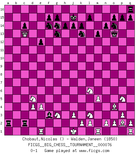 Last move : 0-1 2011 May 26 6:44:44 [Event "FICGS__BIG_CHESS__TOURNAMENT__000076"] [Site "FICGS"] [Date "2011.02.15"] [Round "1"] [White "Chobaut,Nicolas"] [Black "Walden,Janeen"] [Result "0-1"] [WhiteElo ""] [BlackElo "1850"] 1.g2-g4 h15-g13 2.b1-c3 j15-k13 3.j2-h4 m15-m13 4.d2-d4 p16-o14 5.e2-e4 l16-p12 6.f1-c4 n15-n14 7.c1-k8 o16-h10 8.k8-h10 h16-o10 9.h10-c15 b16-c14 10.c4-h9 e15-e13 11.p1-o3 o10-h10 12.h1-m5 g13-e14 13.h9-c14 d15-c14 14.c15-a13 e14-f12 15.m2-m4 c16-l8 16.m5-b5 b15-b14 17.a13-k4 a16-d16 18.c3-d5 d16-d13 19.p2-p3 d13-b13 20.b5-a6 b13-b2 21.a6-a15 g16-f14 22.e1-e2 p12-m9 23.l1-o4 h10-k10 24.h4-f5 f16-c13 25.a15-a3 b2-b10 26.o1-p2 k16-h15 27.k1-l3 j16-j15 28.k4-p9 k15-k14 29.g1-j2 e16-a16 30.a3-c5 k10-p10 31.p9-l5 p10-h3 32.j2-k4 h3-h7 33.a1-h1 a16-a2 34.h2-j4 h7-o13 35.l5-c13 b14-c13 36.c5-c13 l8-g4 37.e2-e3 f12-g14 38.j4-g5 b10-b2 39.e3-c3 h15-g13 40.o3-p5 m16-d16 41.f5-g3 e13-e12 42.m4-m5 d16-d11 43.k4-l6 d11-f11 44.f2-f3 g4-f3 45.g5-f3 f11-f3 46.c3-f3 m9-f3 47.h1-e1 b2-c2 0-1 This big chess game has been lost on time (started : 2011.02.15 1:15:14) Follow this game move after move (download)When your house is on fire, you can't be bothered with the neighbors. Or, as we say in Chess, if your King is under attack you don't worry about losing a Pawn on the Queen's side. (Gary Kasparov) Kritik überlasse ich den Spießern. Ich zeige nichts, wofür ich mich schämen muss. (Alexandra Kosteniuk) Cuando tengas duda... ¡juega al Ajedrez!. (Tevis) On a dit que l'homme se distingue de l'animal par le fait qu'il achète plus de livres qu'il ne peut en lire. Je voudrais suggérer qu'inclure à la liste des livres quelques livres d'échecs rendrait la distinction manifeste. (Edward Lasker) 'preceded by its own quotation yields a falsehood' preceded by its own quotation yields a falsehood. (W. V. O. Quine - Set Theory And Its Logic, 1953)