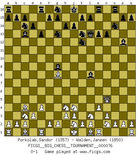 Last move : 0-1 2011 April 6 14:39:54 [Event "FICGS__BIG_CHESS__TOURNAMENT__000076"] [Site "FICGS"] [Date "2011.02.15"] [Round "1"] [White "Porkolab,Sandor"] [Black "Walden,Janeen"] [Result "0-1"] [WhiteElo "1357"] [BlackElo "1850"] 1.j2-h4 j15-k13 2.h1-o7 h15-g13 3.o7-o15 m15-m13 4.o15-o4 b16-c14 5.b1-c3 n15-n13 6.h2-j4 p16-o14 7.e2-e4 e15-e13 8.f1-c4 f16-c13 9.m2-m4 o16-g9 10.n2-n3 l16-p12 11.o1-g8 q16-o16 12.o4-n5 k16-l14 13.p1-n2 h16-l13 14.k1-l3 d15-d14 15.d2-d3 c16-l8 16.g1-j2 l14-k12 0-1 This big chess game has been lost on time (started : 2011.02.15 1:15:14) Follow this game move after move (download)Botvinnik tried to take the mystery out of Chess, always relating it to situations in ordinary life. He used to call Chess a typical inexact problem similar to those which people are always having to solve in everyday life. (Garry Kasparov) Ich habe Kasparov in Rente geschickt. (Veselin Topalov) Uno no tiene que jugar muy bien, es suficiente jugar mejor que el oponente. (Siegbert Tarrasch) Une platitude souvent récitée à propos des Echecs est qu'une des choses les plus difficiles à réaliser est de gagner une position gagnante. Cela ne manque pas de sens mais, pour ma part, j'ai toujours trouvé plus difficile de gagner une position perdante. (Tim Krabbe) There are two kinds of tragedy in this world, one is not getting what you want and the other is getting. (Lord of war)