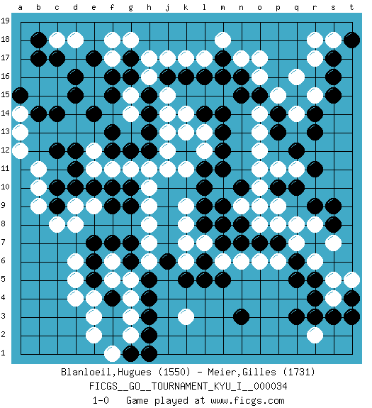 Last move : 1-0 2011 February 24 12:12:54 [Event "FICGS__GO__TOURNAMENT_KYU_I__000034"] [Site "FICGS"] [Date "2011.02.15"] [Round "1"] [Black "Blanloeil,Hugues"] [White "Meier,Gilles"] [Result "1-0"] [Rating 1 "1550"] [Rating 2 "1731"] 1.q3 q16 2.d16 d4 3.r5 f17 4.c14 j17 5.d11 c8 6.r14 o16 7.q12 k3 8.n3 e3 9.s16 r17 10.r9 d18 11.c17 b11 12.c9 b9 13.c10 b10 14.c12 d8 15.k16 k17 16.l16 l17 17.m16 n17 18.m17 m18 19.j16 h16 20.h15 g15 21.g16 h17 22.f16 e16 23.e17 e15 24.f15 g14 25.g17 f18 26.e14 g18 27.d15 j15 28.h14 j14 29.h13 j13 30.m14 o14 31.n16 o17 32.m12 j11 33.h12 j12 34.f9 h11 35.g12 g11 36.f12 o12 37.l11 h8 38.g9 h9 39.g10 h10 40.f7 f11 41.e10 e12 42.f13 e11 43.d12 o10 44.m9 m10 45.l10 n9 46.l8 h6 47.n8 f5 48.e6 d6 49.e5 d5 50.f4 f6 51.e7 e4 52.g6 g5 53.g7 h7 54.h5 g4 55.h4 g3 56.k5 k6 57.l5 k9 58.l9 k8 59.l6 l7 60.m7 k7 61.j6 l13 62.m13 l12 63.m11 k14 64.h3 g2 65.h2 o8 66.o7 p8 67.p7 q8 68.q10 a14 69.b14 a12 70.a15 a13 71.b18 c18 72.b17 d9 73.d10 e9 74.f10 q7 75.q6 s7 76.s8 r8 77.s9 s5 78.r4 s4 79.s3 r6 80.n10 o11 81.s17 r15 82.s15 q14 83.r13 s18 84.t18 r18 85.g1 f1 86.h1 e2 87.t4 t5 88.t3 q11 89.r11 p11 90.o9 p9 91.p10 n9 92.l14 k11 93.o9 p6 94.q5 n9 95.k12 k13 96.o9 o6 97.n7 n9 98.p13 o13 99.o9 r2 100.r3 n9 101.p14 o9 102.o15 p15 103.n15 m6 104.m5 n6 105.m8 1-0 Here are the names of the openings (joseki) played in the four corners : Corner d16 : d16 f17 Hoshi (Hwajeom, Seongjeom, Xingwei`) 4-4 Point. The star or hoshi (4-4) point, emphasizing influence at the potential expense of territory. Ikken Kakari (Hankan Keolch'im, Yi Gua`jiao~, 1-Space Low Approach). White 2 is the standard approach move to the 4-4. Corner q16 : q16 r14 Hoshi (Hwajeom, Seongjeom, Xingwei`) 4-4 Point. The star or hoshi (4-4) point, emphasizing influence at the potential expense of territory. Ikken Kakari (Hankan Keolch'im, Yi Gua`jiao~, 1-Space Low Approach). Black 2 is the standard approach move to the 4-4. Player Black won this Go (weiqi, baduk) game. Follow this game move after move (download)Go is not a blocking game, it's a game of action. (Pierre Audouard) He who laughs last probably does not get the joke. (Unknown)