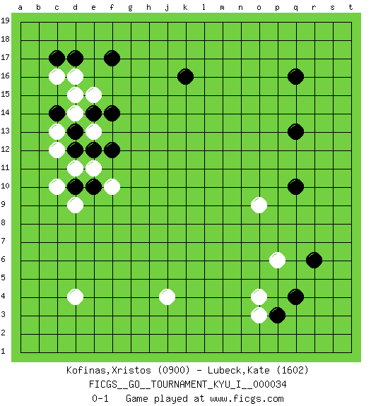 Last move : 0-1 2011 April 19 4:4:12 [Event "FICGS__GO__TOURNAMENT_KYU_I__000034"] [Site "FICGS"] [Date "2011.02.15"] [Round "1"] [Black "Kofinas,Xristos"] [White "Lubeck,Kate"] [Result "0-1"] [Rating 1 "0900"] [Rating 2 "1602"] 1.q4 d16 2.q16 d4 3.q10 c10 4.k16 o3 5.p3 o4 6.f17 j4 7.c14 e15 8.c17 c16 9.d17 c12 10.d12 c13 11.d13 d14 12.e14 d15 13.d10 d9 14.e10 e13 15.f14 d11 16.e12 e11 17.f12 f10 18.q13 p6 19.r6 o9 0-1 This go game has been lost on time (started : 2011.02.15 13:21:24) Here are the names of the openings (joseki) played in the four corners : Corner q4 : q4 o3 Hoshi (Hwajeom, Seongjeom, Xingwei`) 4-4 Point. The star or hoshi (4-4) point, emphasizing influence at the potential expense of territory. Ikken Kakari (Hankan Keolch'im, Yi Gua`jiao~, 1-Space Low Approach). White 2 is the standard approach move to the 4-4. Corner d16 : d16 f17 Hoshi (Hwajeom, Seongjeom, Xingwei`) 4-4 Point. The star or hoshi (4-4) point, emphasizing influence at the potential expense of territory. Ikken Kakari (Hankan Keolch'im, Yi Gua`jiao~, 1-Space Low Approach). Black 2 is the standard approach move to the 4-4. Player White won this Go (weiqi, baduk) game. Follow this game move after move (download)If your stone is capped, play the knight's move. (Anonymous) Life is like a game of cards: the hand you are dealt represents determinism; the way you play it is free will. (Jawaharlal Nehru)