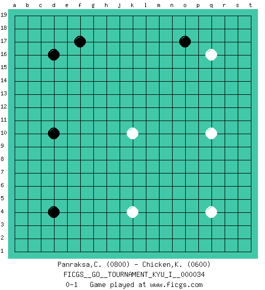 Last move : 0-1 2011 March 24 0:35:54 [Event "FICGS__GO__TOURNAMENT_KYU_I__000034"] [Site "FICGS"] [Date "2011.02.15"] [Round "1"] [Black "Panraksa,Chatchawan"] [White "Chicken,Kung Pow"] [Result "0-1"] [Rating 1 "0800"] [Rating 2 "0600"] 1.d4 q16 2.d16 q4 3.f17 k4 4.d10 q10 5.o17 k10 0-1 This go game has been lost on time (started : 2011.02.15 13:21:24) Here are the names of the openings (joseki) played in the four corners : Corner q16 : q16 o17 Hoshi (Hwajeom, Seongjeom, Xingwei`) 4-4 Point. The star or hoshi (4-4) point, emphasizing influence at the potential expense of territory. Ikken Kakari (Hankan Keolch'im, Yi Gua`jiao~, 1-Space Low Approach). Black 2 is the standard approach move to the 4-4. Player White won this Go (weiqi, baduk) game. Follow this game move after move (download)Knight's moves win running battles. (Anonymous) If only people were all showed a certain minimum level of niceness; if only people didn't retract verbal draw offers (without draw box ticked) on ficgs; if only people didn't kill; if only people didn't run concentration / extermination camps, if only people didn't drop nuclear bombs on Hiroshima and Nagasaki, and so on - it would be a much more beautiful world. But sadly, things are not so... (Normajean Yates)