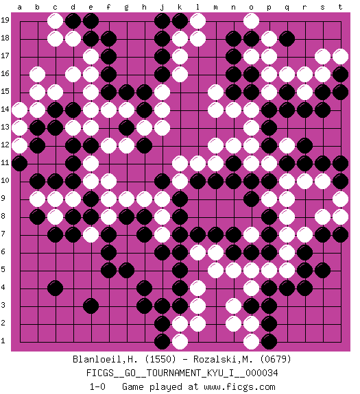Last move : 1-0 2011 March 17 16:29:0 [Event "FICGS__GO__TOURNAMENT_KYU_I__000034"] [Site "FICGS"] [Date "2011.02.15"] [Round "1"] [Black "Blanloeil,Hugues"] [White "Rozalski,Maciej"] [Result "1-0"] [Rating 1 "1550"] [Rating 2 "0679"] 1.c4 q16 2.e3 d16 3.q4 k16 4.k4 k10 5.c14 q10 6.r14 r15 7.q14 p15 8.r11 q12 9.q11 p11 10.p12 o12 11.p13 o13 12.p14 o14 13.f17 e17 14.f16 b16 15.j17 k17 16.j16 j15 17.j18 k18 18.h15 j14 19.h14 h13 20.d10 f10 21.e12 f12 22.c7 b14 23.b13 b15 24.d14 e15 25.f15 e14 26.e18 d18 27.f18 e13 28.d12 e11 29.d11 e10 30.m10 m11 31.n11 m12 32.p10 o11 33.o10 r10 34.s11 s10 35.r12 r7 36.r6 q7 37.p8 q8 38.p7 q6 39.r5 p5 40.p4 o5 41.m7 o7 42.p6 q5 43.o6 n5 44.n6 m5 45.k7 n3 46.p2 l4 47.k3 l3 48.k6 k2 49.j2 k1 50.j1 l2 51.h3 o2 52.p1 o1 53.o3 o4 54.p3 n2 55.s15 s16 56.s14 e7 57.e9 f9 58.e8 f8 59.f7 g7 60.f6 g6 61.f5 j8 62.g5 j7 63.j6 h6 64.q15 r16 65.d19 c19 66.t16 t17 67.t15 s17 68.k19 l19 69.j19 l18 70.o15 p16 71.n15 m14 72.n17 o17 73.o18 p18 74.o16 p17 75.n18 m15 76.q18 n14 77.n16 o19 78.g13 g12 79.h12 j13 80.l10 l11 81.e19 c18 82.k9 j9 83.k8 l6 84.l7 h5 85.h4 j5 86.k5 j4 87.j3 g14 88.g15 f14 89.j10 k11 90.g8 g9 91.h8 h9 92.h7 d13 93.c13 d9 94.d8 c9 95.c10 b9 96.b10 c8 97.d7 c15 98.b8 p9 99.o9 q9 100.s7 s8 101.t7 t8 102.s5 a13 103.b12 a12 104.a11 a14 105.r4 n12 106.n10 e16 107.t10 t9 108.t11 m6 109.n7 pass 110.pass pass 111.pass pass 112.pass pass 113.pass 1-0 Here are the names of the openings (joseki) played in the four corners : Corner d16 : d16 c14 Hoshi (Hwajeom, Seongjeom, Xingwei`) 4-4 Point. The star or hoshi (4-4) point, emphasizing influence at the potential expense of territory. Ikken Kakari (Hankan Keolch'im, Yi Gua`jiao~, 1-Space Low Approach). Black 2 is the standard approach move to the 4-4. Corner q16 : q16 r14 Hoshi (Hwajeom, Seongjeom, Xingwei`) 4-4 Point. The star or hoshi (4-4) point, emphasizing influence at the potential expense of territory. Ikken Kakari (Hankan Keolch'im, Yi Gua`jiao~, 1-Space Low Approach). Black 2 is the standard approach move to the 4-4. Corner q4 : q4 r7 Hoshi (Hwajeom, Seongjeom, Xingwei`) 4-4 Point. The star or hoshi (4-4) point, emphasizing influence at the potential expense of territory. Niken Kakari (Dukan Keolch'im, E`r Gua`jiao~, 2-Space Low Approach). Black typically answers by 7-3 or 3-5 (which is not joseki). Player Black won this Go (weiqi, baduk) game. Follow this game move after move (download)Five groups might live but the six will die. (Anonymous) The project of the man are lower than those of the sky. (Chinese proverb)