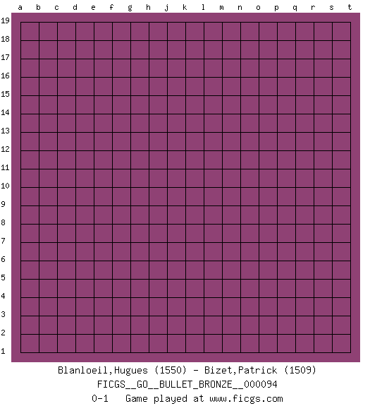 Last move : 0-1 2011 February 15 19:31:41 [Event "FICGS__GO__BULLET_BRONZE__000094"] [Site "FICGS"] [Date "2011.02.15"] [Round "1"] [Black "Blanloeil,Hugues"] [White "Bizet,Patrick"] [Result "0-1"] [Rating 1 "1550"] [Rating 2 "1509"] 0-1 This go game has been lost on time (started : 2011.02.15 14:27:8) Here are the names of the openings (joseki) played in the four corners : Player White won this Go (weiqi, baduk) game. Follow this game move after move (download)Do not fear furikawari. (Anonymous) No, I am still playing. (Anatoly Karpov)