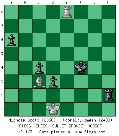 Last move : 1/2-1/2 2011 February 15 16:55:1 [Event "FICGS__CHESS__BULLET_BRONZE__000507"] [Site "FICGS"] [Date "2011.02.15"] [Round "1"] [White "Nichols,Scott"] [Black "Nookala,Kamesh"] [Result "1/2-1/2"] [WhiteElo "2358"] [BlackElo "2403"] 1.Nf3 Nf6 2.g3 d5 3.Bg2 c6 4.O-O Bf5 5.c4 e6 6.cxd5 exd5 7.d3 Na6 8.a3 Be7 9.Nd4 Bg6 10.Nd2 c5 11.N4f3 O-O 12.Qb3 Rb8 13.Nh4 Bh5 14.Nf5 Re8 15.Nf3 Qd7 16.Nxe7+ Rxe7 17.Re1 h6 18.Qd1 b6 19.b4 d4 20.Bb2 Rbe8 21.Qd2 Nd5 22.Rac1 Bg4 23.bxc5 bxc5 24.Ba1 Bh3 25.Bh1 Qd6 26.Nh4 Nac7 27.Be4 Ne6 28.Qc2 Rc7 29.Qc4 Nb6 30.Qb5 Rb8 31.Bh1 Nd7 32.Qa5 Rb6 33.Qd2 Ne5 34.Qa2 Qe7 35.a4 Rc8 36.Qd5 Nf4 37.Qe4 Re8 38.Nf5 Bxf5 39.Qxf4 Bd7 40.Be4 Bxa4 41.Qf5 g6 42.Qf4 Kh7 43.e3 Re6 44.Re2 f5 45.exd4 fxe4 46.dxe5 exd3 47.Rd2 Bb5 48.Qe4 Rd8 49.h4 h5 50.Kh2 c4 51.f4 Qe8 52.Bc3 Rd7 53.Rb2 a6 54.Rf2 Rf7 55.Kg1 Kg8 56.Rcf1 Rf5 57.Ra2 Rb6 58.Qd5+ Kh7 59.Rb2 Qg8 60.Qxg8+ Kxg8 61.Kf2 Kf7 62.Re1 Ke6 63.Re4 Rc6 64.Rd4 Rf7 65.Ke3 Kf5 66.Rb1 Re7 67.Kd2 Rc8 68.Rd6 Rf8 69.Rg1 Re6 70.g4+ hxg4 71.Rxe6 Kxe6 72.Rxg4 Kf5 73.Rg5+ Kxf4 74.e6 Rf5 75.Rxg6 Rh5 76.Rf6+ Ke4 77.e7 Rxh4 78.Re6+ Kf4 79.e8Q Bxe8 80.Rxe8 Rh2+ 81.Kd1 1/2-1/2 Reti Opening Kingside Castling by player White (move 4) Kingside Castling by player Black (move 11) 10 pieces endgame at move 77 : White KRBP , Black KRBPPP WHITE : King + 1 Rook 1 Bishop 1 Pawn BLACK : King + 1 Rook 1 Bishop 3 Pawns Promotion Queen by player White (move 79) 9 pieces endgame at move 79 : White KRB , Black KRBPPP WHITE : King + 1 Rook 1 Bishop BLACK : King + 1 Rook 1 Bishop 3 Pawns 8 pieces endgame at move 80 : White KRB , Black KRPPP WHITE : King + 1 Rook 1 Bishop BLACK : King + 1 Rook 3 Pawns This chess game ended in a draw. Follow this game move after move (download)Who is your opponent tonight, tonight I am playing against the Black pieces. (Akiba Rubinstein) Gewinnen beim Schach fördert das Selbstvertrauen. Beim Sex spüre ich sowas nicht... (Garry Kasparov) Un jugador que trata de regresar una movida en el Ajedrez es un futuro carterista. (Richard Fenton) On croit qu'il y a plus de mauvais joueurs que de bons joueurs, c'est faux : Il y a autant de joueurs qui gagnent que de joueurs qui perdent. (Philippe Geluck) If you lose the game you should win the analysis! (Proverb)