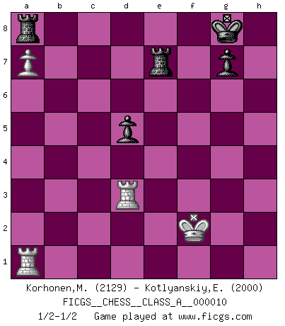 Last move : 1/2-1/2 2007 May 28 18:4:33 [Event "FICGS__CHESS__CLASS_A__000010"] [Site "FICGS"] [Date "2006.12.06"] [Round "1"] [White "Korhonen,Marko"] [Black "Kotlyanskiy,Edward"] [Result "1/2-1/2"] [WhiteElo "2129"] [BlackElo "2000"] 1.e4 c5 2.Nf3 Nc6 3.d4 cxd4 4.Nxd4 Nf6 5.Nc3 e5 6.Ndb5 d6 7.Bg5 a6 8.Na3 b5 9.Nd5 Be7 10.Nxe7 Qxe7 11.c4 Nd4 12.Nc2 Nxc2+ 13.Qxc2 Bd7 14.cxb5 axb5 15.Bd3 h6 16.Bd2 O-O 17.O-O Rfc8 18.Qd1 Be6 19.a3 Bc4 20.Bb4 Rd8 21.Re1 Qe6 22.Bxc4 bxc4 23.Qe2 Rac8 24.a4 Rb8 25.Bc3 Nd7 26.a5 Nc5 27.Red1 Rdc8 28.h3 Rc6 29.Ra3 Rbc8 30.Rd5 f5 31.Qxc4 fxe4 32.Ra1 Qf7 33.Be1 Nd3 34.Qxe4 Nf4 35.Rd2 d5 36.Qe3 Qg6 37.f3 Rc2 38.g4 Nxh3+ 39.Kh1 Qa6 40.Bg3 e4 41.fxe4 Ng5 42.Qd3 Qxd3 43.Rxd3 Nxe4 44.b4 Nxg3+ 45.Rxg3 Rb2 46.g5 Rxb4 47.gxh6 Rh4+ 48.Kg1 Rxh6 49.a6 Rb6 50.a7 Ra8 51.Rga3 Rb7 52.Kf2 Re7 53.Rd3 1/2-1/2 Sicilian : Pelikan (Lasker/Sveshnikov) variation Kingside Castling by player Black (move 16) Kingside Castling by player White (move 17) 10 pieces endgame at move 47 : White KRRPP , Black KRRPP WHITE : King + 2 Rooks 2 Pawns BLACK : King + 2 Rooks 2 Pawns 9 pieces endgame at move 48 : White KRRP , Black KRRPP WHITE : King + 2 Rooks 1 Pawn BLACK : King + 2 Rooks 2 Pawns This chess game ended in a draw. Follow this game move after move (download)It is no time to be playing Chess when the house is on fire. (Italian Proverb) Die Partien sind immer verschieden, die Interviews immer die gleichen. (Garry Kasparov) El hombre es un frívolo, una creatura engañosa y como un jugador de Ajedrez, se preocupa mas por el proceso de obtener su meta que de la meta por sí misma. (Dostoyevsky) Les sacrifices démontrent seulement que quelqu'un a gaffé. (Savielly Tartacover) Lamb in skin of tiger, still fears the wolf. (Chinese proverb)