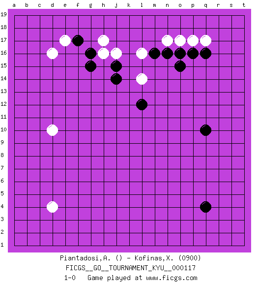 Last move : 1-0 2011 April 16 3:55:44 [Event "FICGS__GO__TOURNAMENT_KYU__000117"] [Site "FICGS"] [Date "2011.02.15"] [Round "1"] [Black "Piantadosi,Angelo"] [White "Kofinas,Xristos"] [Result "1-0"] [Rating 2 "0900"] 1.q16 d16 2.q4 d4 3.q10 d10 4.f17 h17 5.g16 h16 6.g15 l16 7.j14 l14 8.j15 j16 9.l12 o17 10.o15 p17 11.p16 q17 12.o16 e17 13.n16 n17 14.m16 1-0 This go game has been lost on time (started : 2011.02.15 22:33:8) Here are the names of the openings (joseki) played in the four corners : Corner d16 : d16 f17 Hoshi (Hwajeom, Seongjeom, Xingwei`) 4-4 Point. The star or hoshi (4-4) point, emphasizing influence at the potential expense of territory. Ikken Kakari (Hankan Keolch'im, Yi Gua`jiao~, 1-Space Low Approach). Black 2 is the standard approach move to the 4-4. Corner q16 : q16 l16 Hoshi (Hwajeom, Seongjeom, Xingwei`) 4-4 Point. The star or hoshi (4-4) point, emphasizing influence at the potential expense of territory. Corner q4 : q4 1-0 Hoshi (Hwajeom, Seongjeom, Xingwei`) 4-4 Point. The star or hoshi (4-4) point, emphasizing influence at the potential expense of territory. Player Black won this Go (weiqi, baduk) game. Follow this game move after move (download)Beginner's games are surprising, often incoherent and incomprehensible. When you improve, your game gains in consistency but flirts with stupidity: you become satisfied with truisms and mechanical movements, you try to obtain a feeling for clearness and style the easy way. (Pierre Audouard) There are more things in heaven and earth than practically anywhere else. (Unknown)
