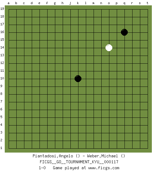 Last move : 1-0 2011 February 19 12:25:12 [Event "FICGS__GO__TOURNAMENT_KYU__000117"] [Site "FICGS"] [Date "2011.02.15"] [Round "1"] [Black "Piantadosi,Angelo"] [White "Weber,Michael"] [Result "1-0"] 1.q16 o14 2.k10 1-0 Here are the names of the openings (joseki) played in the four corners : Corner q16 : q16 o14 Hoshi (Hwajeom, Seongjeom, Xingwei`) 4-4 Point. The star or hoshi (4-4) point, emphasizing influence at the potential expense of territory. Player Black won this Go (weiqi, baduk) game. Follow this game move after move (download)Answer the keima with a kosumi. (Anonymous) Programming can only do so much before it becomes too much. (Don Groves)