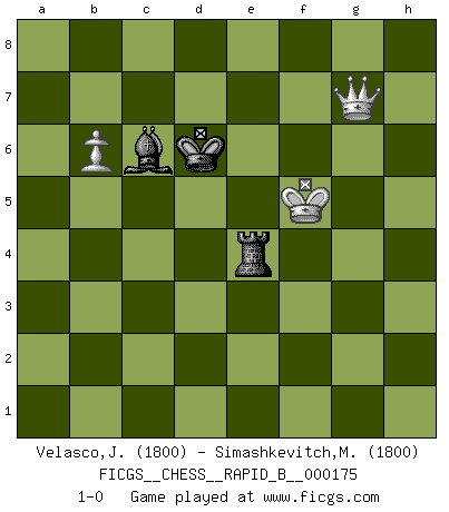 Last move : 1-0 2011 March 24 16:2:39 [Event "FICGS__CHESS__RAPID_B__000175"] [Site "FICGS"] [Date "2011.02.17"] [Round "1"] [White "Velasco,Jose Maria"] [Black "Simashkevitch,Mykola"] [Result "1-0"] [WhiteElo "1800"] [BlackElo "1800"] 1.d4 d5 2.c4 c6 3.Nf3 Nf6 4.Nc3 e6 5.Bg5 h6 6.Bh4 dxc4 7.e4 g5 8.Bg3 b5 9.Be2 Bb7 10.h4 g4 11.Ne5 h5 12.O-O Nbd7 13.Qc2 Nxe5 14.Bxe5 Bg7 15.Rad1 O-O 16.Bg3 Nd7 17.e5 c5 18.Nxb5 cxd4 19.Nxd4 Qc7 20.Bxc4 Nxe5 21.Bxe5 Qxe5 22.Rfe1 Qf4 23.Nxe6 fxe6 24.Rxe6 Rac8 25.Rd7 Rxc4 26.Rxg7+ Kxg7 27.Qg6+ Kh8 28.Qxh5+ Kg7 29.Rg6+ Kf7 30.Rxg4 Ke6 31.Rxf4 Rcxf4 32.f3 Bd5 33.Qg6+ R4f6 34.Qd3 Rg8 35.Kh2 Rf7 36.Kh3 Ke5 37.b3 Rgf8 38.Qc3+ Kd6 39.Qd2 Ke5 40.h5 Rg8 41.b4 Rf5 42.Kh4 Rf4+ 43.g4 Rxf3 44.Qb2+ Kd6 45.Qh2+ Kd7 46.Qd2 Ke6 47.h6 Rh8 48.a4 Kd6 49.Qg5 Rf7 50.Qc1 R8h7 51.g5 Rf5 52.Qc5+ Ke6 53.Qe3+ Re5 54.g6 Re4+ 55.Kg5 Rxh6 56.g7 Rxe3 57.g8Q+ Kd7 58.Qg7+ Re7 59.Qxh6 Re5+ 60.Kf4 Re4+ 61.Kf5 Bb7 62.Qf6 a6 63.b5 axb5 64.axb5 Re7 65.Qd4+ Ke8 66.b6 Bc8+ 67.Kg5 Bb7 68.Qh8+ Kf7 69.Qf6+ Ke8 70.Qg6+ Kd7 71.Qg8 Bc6 72.Kf6 Re4 73.Qg7+ Kd6 74.Kf5 1-0 QGD Slav : 4.Nc3 Kingside Castling by player White (move 12) Kingside Castling by player Black (move 15) 10 pieces endgame at move 55 : White KQPPP , Black KRRBP WHITE : King + 1 Queen 3 Pawns BLACK : King + 2 Rooks 1 Bishop 1 Pawn 9 pieces endgame at move 56 : White KPPP , Black KRRBP WHITE : King + 3 Pawns BLACK : King + 2 Rooks 1 Bishop 1 Pawn Promotion Queen by player White (move 57) 8 pieces endgame at move 59 : White KQPP , Black KRBP WHITE : King + 1 Queen 2 Pawns BLACK : King + 1 Rook 1 Bishop 1 Pawn 7 pieces endgame at move 63 : White KQP , Black KRBP WHITE : King + 1 Queen 1 Pawn BLACK : King + 1 Rook 1 Bishop 1 Pawn 6 pieces endgame at move 64 : White KQP , Black KRB WHITE : King + 1 Queen 1 Pawn BLACK : King + 1 Rook 1 Bishop Player White won this chess game. Follow this game move after move (download)The chessboard is the world, the pieces are the phenomena of the Universe, the rules of the game are what we call the laws of Nature and the player on the other side is hidden from us. (Thomas Huxley) Es ist wirklich schade, dass so viele Schachspieler nicht auf ihr Äußeres achten! (Alexandra Kosteniuk) Ser exitoso en el Ajedrez te permite descubrir tu propia personalidad. Eso es lo que deseo para los niños de mi clase. (Saudin Robovic) Il vaut mieux sacrifier les pièces de l'adversaire. (Xavier Tartacover) Follow your passion, and success will follow you. (Arthur Buddhold)