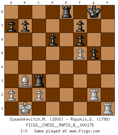 Last move : 1-0 2011 April 2 19:10:7 [Event "FICGS__CHESS__RAPID_B__000175"] [Site "FICGS"] [Date "2011.02.17"] [Round "1"] [White "Simashkevitch,Mykola"] [Black "Ropokis,Dimitrios"] [Result "1-0"] [WhiteElo "1800"] [BlackElo "1798"] 1.e4 c5 2.Nf3 Nc6 3.d4 cxd4 4.Nxd4 g6 5.Nc3 Bg7 6.Be3 Nf6 7.Bc4 O-O 8.Bb3 d6 9.f3 Bd7 10.Qd2 Rc8 11.O-O-O Ne5 12.Kb1 Re8 13.h4 h5 14.g4 hxg4 15.h5 Nxh5 16.Rdg1 Qa5 17.Bh6 Bf6 18.fxg4 Nxg4 19.Nf5 Bxc3 20.bxc3 Nhf6 21.Bg7 Bxf5 22.Bxf6 exf6 23.exf5 g5 24.Rxg4 Qxc3 25.Qxc3 Rxc3 26.Rg2 1-0 Sicilian : Accelerated Fianchetto, Modern variation with Bc4 Kingside Castling by player Black (move 7) Queenside Castling by player White (move 11) Player White won this chess game. Follow this game move after move (download)I am the best player in the world and I am here to prove it. (Bobby Fischer) Das ganze Leben mit einer Ehefrau ist wie ein Endspiel mit ungleichfarbigen Läufern. (Viktor Kortschnoi) Botvinnik trató de alejar el misterio referente al Ajedrez, siempre relacionandolo a situaciones de la vida diaria. Solía llamar al Ajedrez un problema inexacto típico, similar a aquellos en que la gente tiene siempre que resolver a cada día. (Garry Kasparov) Une platitude souvent récitée à propos des Echecs est qu'une des choses les plus difficiles à réaliser est de gagner une position gagnante. Cela ne manque pas de sens mais, pour ma part, j'ai toujours trouvé plus difficile de gagner une position perdante. (Tim Krabbe) Luck is when opportunity knocks and you answer. (Anonymous)