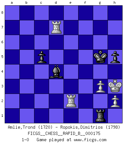 Last move : 1-0 2011 June 8 19:13:23 [Event "FICGS__CHESS__RAPID_B__000175"] [Site "FICGS"] [Date "2011.02.17"] [Round "1"] [White "Amlie,Trond"] [Black "Ropokis,Dimitrios"] [Result "1-0"] [WhiteElo "1720"] [BlackElo "1798"] 1.e4 c5 2.Nf3 g6 3.d4 Bg7 4.d5 d6 5.Nc3 Nf6 6.Bb5+ Nbd7 7.a4 O-O 8.O-O a6 9.Be2 Rb8 10.a5 Ne8 11.Re1 Ne5 12.Nxe5 Bxe5 13.Bh6 Ng7 14.Qd2 Bd7 15.Nd1 e6 16.dxe6 Bxe6 17.g3 Re8 18.c3 b5 19.axb6 Rxb6 20.Ne3 Qb8 21.Reb1 Qb7 22.Bc4 Rb8 23.f4 Bf6 24.Bxe6 fxe6 25.e5 dxe5 26.Nc4 e4 27.Bxg7 Kxg7 28.Nxb6 Qxb6 29.Re1 Qxb2 30.Qxb2 Rxb2 31.Rxe4 Bxc3 32.Rxa6 Bd4+ 33.Kh1 Kf6 34.Raxe6+ Kf5 35.Re2 Rb1+ 36.Kg2 g5 37.fxg5 Rg1+ 38.Kh3 Kxg5 39.Re7 h5 40.Rd7 1-0 Sicilian : Hungarian variation Kingside Castling by player Black (move 7) Kingside Castling by player White (move 8) 10 pieces endgame at move 38 : White KRRPP , Black KRBPP WHITE : King + 2 Rooks 2 Pawns BLACK : King + 1 Rook 1 Bishop 2 Pawns Player White won this chess game. Follow this game move after move (download)Chess, like love, like music, has the power to make people happy. (Siegbert Tarrasch) Als ich elf wurde, wurde ich einfach gut. (Robert James Fischer) El Ajedrez lo es todo: arte, ciencia y deporte. (Anatoly Karpov) Les échecs, c'est la lutte contre l'erreur. (Johannes Zukertort) Your best chance to get a Royal Flush in a casino is in the bathroom. (Anonymous)