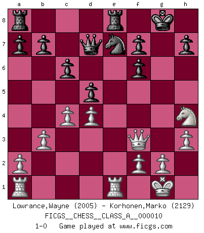 Last move : 1-0 2007 February 18 21:44:54 [Event "FICGS__CHESS__CLASS_A__000010"] [Site "FICGS"] [Date "2006.12.06"] [Round "1"] [White "Lowrance,Wayne"] [Black "Korhonen,Marko"] [Result "1-0"] [WhiteElo "2005"] [BlackElo "2129"] 1.e4 e6 2.d4 d5 3.exd5 exd5 4.Nf3 Bg4 5.Bb5+ c6 6.Bd3 Bd6 7.O-O Qc7 8.h3 Bh5 9.Re1+ Ne7 10.b3 Nd7 11.c4 Nf6 12.Nc3 Bb4 13.Bd2 Bxc3 14.Bxc3 O-O 15.Bd2 Bg6 16.Bg5 Bxd3 17.Qxd3 Rfe8 18.Bxf6 gxf6 19.Nh4 Qd7 20.Qf3 1-0 Comment by player 2 : Marko Korhonen : Well played. Thanks for lesson. Seems my 7...Qc7 was time wasting move. Optionally good, but does nothing. Really good lesson for me. French : Exchange variation Kingside Castling by player White (move 7) Kingside Castling by player Black (move 14) Player White won this chess game. Follow this game move after move (download)The older I grow, the more I value pawns. (Paul Keres) Es ist peinlich, dass ich nie Weltmeister wurde. Es wäre leicht, Leonid Breschnjew als Ursache vorzuschieben, dessen Apparat den Vorzeigekommunisten Anatoli Karpow in allem unterstützte. Aber Garri Kasparow zum Beispiel, der ebenfalls von den Sowjets unerwünscht war, hat trotz der Widerstände den WM-Titel erobert. (Viktor Kortschnoi) El Ajedrez es imaginación. (David Bronstein) La victoire dans une partie d'Echecs appartient la plupart du temps à celui qui voit un peu plus loin que l'adversaire. (Lasker) If you work for a living, why do you kill yourself working ? (Tuco to a chicken in The Good, The Bad and The Ugly)