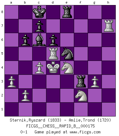 Last move : 0-1 2011 April 18 20:26:0 [Event "FICGS__CHESS__RAPID_B__000175"] [Site "FICGS"] [Date "2011.02.17"] [Round "1"] [White "Sternik,Ryszard"] [Black "Amlie,Trond"] [Result "0-1"] [WhiteElo "1833"] [BlackElo "1720"] 1.e4 e5 2.f4 exf4 3.Nf3 g5 4.h4 g4 5.Ne5 d6 6.Nxg4 Be7 7.Qf3 Bxh4+ 8.Nf2 Bg3 9.d4 Qf6 10.Nc3 Qxd4 11.Bxf4 Bxf4 12.Qxf4 Be6 13.Rd1 Qf6 14.Bb5+ Nd7 15.Bxd7+ Bxd7 16.Qe3 Ne7 17.Kd2 O-O-O 18.Qxa7 Qg5+ 19.Qe3 Qxe3+ 20.Kxe3 Rdg8 21.Rdg1 f5 22.Rh2 Rg7 23.Rgh1 Bc6 24.a3 fxe4 25.Ncxe4 Rf7 26.c4 Ng6 27.Kd4 Re8 28.Rxh7 Rf4 29.g3 Rf3 30.R1h5 b6 31.Rd5 Ne5 0-1 KGA : Kieseritsky, Kolisch defense Queenside Castling by player Black (move 17) Player Black won this chess game. Follow this game move after move (download)The boy (then a 12 year old boy named Anatoly Karpov) doesn't have a clue about Chess, and there's no future at all for him in this profession. (Mikhail Botvinnik) Es gibt Leute, die glauben, alles wäre vernünftig, was man mit einem ernsthaften Gesicht tut. (Georg Christoph Lichtenberg) El sobresalir en el Ajedrez es un signo de una mente intrigante. (Sir Arthur Conan Doyle) Toutes choses étant égales, c'est la conviction qui gagne. Alliée à une volonté de vaincre, elle sert de détonateur, suscite des idées, disperse les doutes et aide à penser clairement. (Robert Fischer) Nowadays, anyone who cannot speak English and is incapable of using the Internet is regarded as backward. (Al-Waleed bin Talal)