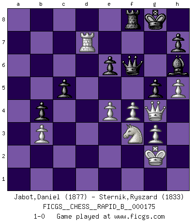 Last move : 1-0 2011 April 22 22:32:43 [Event "FICGS__CHESS__RAPID_B__000175"] [Site "FICGS"] [Date "2011.02.17"] [Round "1"] [White "Jabot,Daniel"] [Black "Sternik,Ryszard"] [Result "1-0"] [WhiteElo "1877"] [BlackElo "1833"] 1.e4 c5 2.Nf3 Nc6 3.d4 cxd4 4.Nxd4 Nf6 5.Nc3 e5 6.Ndb5 d6 7.Bg5 a6 8.Na3 b5 9.Nd5 Be7 10.Bxf6 Bxf6 11.c4 b4 12.Nc2 Rb8 13.b3 Bg5 14.g3 O-O 15.h4 Bh6 16.Bh3 Be6 17.Kf1 a5 18.Qd3 Ne7 19.Nxe7+ Qxe7 20.Kg2 a4 21.Rad1 Qb7 22.Qe2 Qc6 23.Bxe6 fxe6 24.Rd3 Rb6 25.Qg4 Rf7 26.Rhd1 Qc5 27.Rf3 Rxf3 28.Qxf3 Rb7 29.Ne1 Qb6 30.Nd3 Rf7 31.c5 dxc5 32.Qe2 Qc7 33.Qh5 axb3 34.axb3 Rf8 35.Nxe5 Qb7 36.Qg4 Qe7 37.Rd7 Qf6 38.f4 g6 39.h5 g5 40.Nf3 1-0 Sicilian : Pelikan (Lasker/Sveshnikov) variation Kingside Castling by player Black (move 14) Player White won this chess game. Follow this game move after move (download)We like to think. (Gary Kasparov) Mutter, ich bin eben Ex-Weltmeister geworden. --beim nach Hause Kommen nach dem Verlust des WM-Titels an Mihail Botvinnik -- (Mikhail Nekhemyevich Tal) Es el objetivo de la escuela moderna no tratar cada posición de acuerdo a una regla general, sino de acuerdo al principio inherente en la posición. (Richard Reti) Il n'y a plus de joueurs du niveau de Jacob Murray dont la seule quête est le beau jeu, le plaisir de voir les pièces construire quelque chose. Sur 10 idées à la minute, 9 seront sans intérêt, la dernière s'avèrera géniale. (Christian Bauer) I'll be back. (Arnold Schwarzenegger)