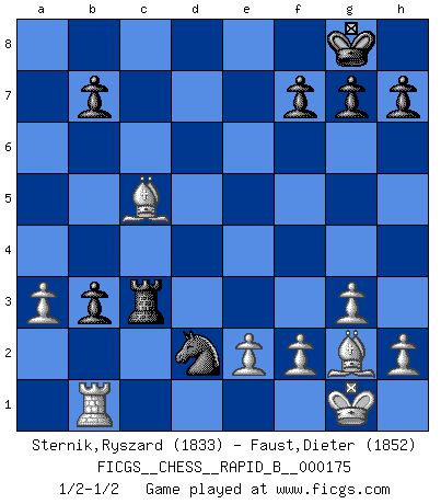 Last move : 1/2-1/2 2011 March 19 14:18:53 [Event "FICGS__CHESS__RAPID_B__000175"] [Site "FICGS"] [Date "2011.02.17"] [Round "1"] [White "Sternik,Ryszard"] [Black "Faust,Dieter"] [Result "1/2-1/2"] [WhiteElo "1833"] [BlackElo "1852"] 1.Nf3 Nf6 2.b4 e5 3.Nxe5 Bxb4 4.Bb2 d5 5.c4 O-O 6.Qb3 a5 7.cxd5 Qxd5 8.Qxd5 Nxd5 9.a3 Bd6 10.d4 c5 11.Nc4 Bc7 12.dxc5 Nd7 13.Bd4 Nf4 14.Nc3 Ne6 15.Be3 Ndxc5 16.Nd5 Bd8 17.Ncb6 Bxb6 18.Nxb6 Ra6 19.Nxc8 Rxc8 20.g3 Rb6 21.Bh3 Rb3 22.O-O Ne4 23.Rfb1 a4 24.Rxb3 axb3 25.Rb1 Rc3 26.Bg2 N6c5 27.Bxc5 Nd2 28.Rb2 Nc4 29.Rb1 Nd2 1/2-1/2 Reti Opening Kingside Castling by player Black (move 5) Kingside Castling by player White (move 22) This chess game ended in a draw. Follow this game move after move (download)You have to have the fighting spirit. You have to force moves and take chances. (Bobby Fischer) Es hat in meinem Leben Zeiten gegeben, in denen das Schachspiel, wenn nicht zum Lebenszweck, so doch zu einem regelrechten Lebensersatz geworden ist. Man fühlt sich in solchen Zeiten nicht so, als besäße man eine göttliche Gabe, sondern eher so, als sei man von ihr besessen. (Garry Kasparov) ¡Examina movidas que hagan daño! Un buen ojo for movidas desvastantes es mucho mas importante que el conocimiento de principios estratégicos. (Purdy) Un millionnaire : 'Monsieur Steinitz ! Vous ne participez aux tournois que pour l'argent, alors que moi je n'y viens que pour l'honneur.' Steinitz : 'Chacun joue pour ce qu'il n'a pas'... Even the best needles are not sharp at both ends. (Chinese proverb)