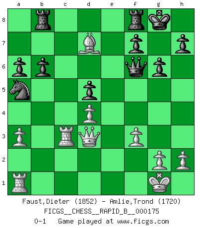 Last move : 0-1 2011 April 27 10:41:5 [Event "FICGS__CHESS__RAPID_B__000175"] [Site "FICGS"] [Date "2011.02.17"] [Round "1"] [White "Faust,Dieter"] [Black "Amlie,Trond"] [Result "0-1"] [WhiteElo "1852"] [BlackElo "1720"] 1.d4 Nf6 2.c4 e6 3.Nc3 Bb4 4.a3 Bxc3+ 5.bxc3 c5 6.f3 O-O 7.e4 d6 8.Bd3 Nc6 9.Ne2 Nd7 10.O-O b6 11.Qa4 Na5 12.Be3 Ba6 13.Ng3 Rc8 14.Rfc1 Nb8 15.Nf1 cxd4 16.cxd4 d5 17.exd5 exd5 18.Rc3 Bxc4 19.Bf5 Rc7 20.Bf4 Rb7 21.Qd1 Bxf1 22.Bxb8 Rxb8 23.Qxf1 Qf6 24.Qd3 g6 25.Bd7 a6 0-1 Nimzo-Indian : Saemisch variation Kingside Castling by player Black (move 6) Kingside Castling by player White (move 10) Player Black won this chess game. Follow this game move after move (download)When I asked Fischer why he had not played a certain move in our game, he replied: 'Well, you laughed when I wrote it down !' (Mikhail Tal) Ich glaube nicht an Psychologie, ich glaube an gute Züge. (Robert James Fischer) Los tropiezos estan todos ahí en el tablero, esperando que se cometan. (Savielly Tartakover) Aucun coup ne doit être joué sans but. (Pedro Damiano) There are 10 types of people in this world: those who understand binary and those who don't. (Anonymous)