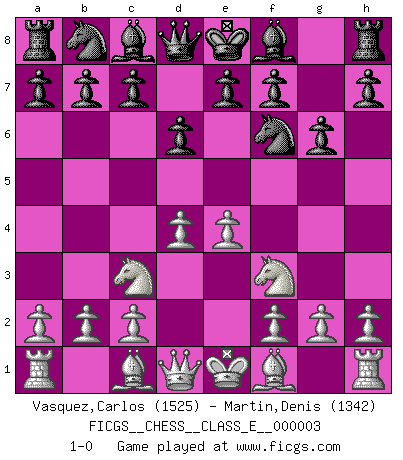 Last move : 1-0 2006 June 15 22:50:2 [Event "FICGS__CHESS__CLASS_E__000003"] [Site "FICGS"] [Date "2006.05.02"] [Round "1"] [White "Vasquez,Carlos"] [Black "Martin,Denis"] [Result "1-0"] [WhiteElo "1525"] [BlackElo "1342"] 1.e4 d6 2.d4 Nf6 3.Nc3 g6 4.Nf3 1-0 This chess game has been lost on time (started : 2006.05.02 13:40:26) Pirc : Classical (Two knights) system Player White won this chess game. Follow this game move after move (download)Only the player with the initiative has the right to attack. (Wilhelm Steinitz) Es gibt keine einzige Frau, der ich nicht einen Springer vorgeben könnte und trotzdem gewänne. (Robert James Fischer) El Ajedrez es la vida. (Bobby Fischer) Les Cavaliers se révèlent fort utiles dans les positions fermées. D'habitude, les Fous sont un peu plus forts que les Cavaliers dans les positions ouvertes. Qu'on le veuille ou non, il restera toujours des exceptions ! Fear is the path to the dark side. Fear leads to anger; anger leads to hate; hate leads to suffering. I sense much fear in you. (Master Yoda in Star Wars ep.1)