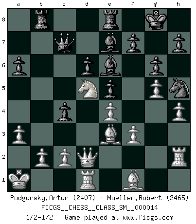 Last move : 1/2-1/2 2011 June 5 17:8:14 [Event "FICGS__CHESS__CLASS_SM__000014"] [Site "FICGS"] [Date "2011.02.18"] [Round "1"] [White "Podgursky,Artur"] [Black "Mueller,Robert"] [Result "1/2-1/2"] [WhiteElo "2407"] [BlackElo "2465"] 1.e4 c5 2.Nf3 d6 3.d4 cxd4 4.Nxd4 Nf6 5.Nc3 a6 6.Be3 e5 7.Nb3 Be6 8.f3 Nbd7 9.g4 b5 10.a3 Nb6 11.g5 Nh5 12.Na5 Qc7 13.Qd2 Be7 14.O-O-O O-O 15.h4 Rab8 16.Rh2 g6 17.Kb1 Nc4 18.Nxc4 bxc4 19.Ka1 Rfe8 20.Nd5 1/2-1/2 Sicilian : Najdorf, Byrne (English) attack Queenside Castling by player White (move 14) Kingside Castling by player Black (move 14) This chess game ended in a draw. Follow this game move after move (download)A chess genius has died; a loss for humanity. (Viktor Kortchnoi, about Bobby Fischer's death) Meine Liebe ist Schach, Schach, Schach. Ich muss jeden Tag Schach spielen, deshalb fühle ich mich so stark. (Miguel Najdorf) Debemos de asegurarnos de que el Ajedrez no se convierta en un lenguaje muerto, muy interesante, pero solo para un grupo muy pequeño. (Sytze Faber) Les échecs sont utiles à l'exercice de la faculté de penser et à celle de l'imagination. Car nous devons posséder une méthode élaborée pour atteindre des buts partout où nous devons conduire notre raison. (Leibnitz) Gambling : The sure way of getting nothing from something. (Wilson Mizner)